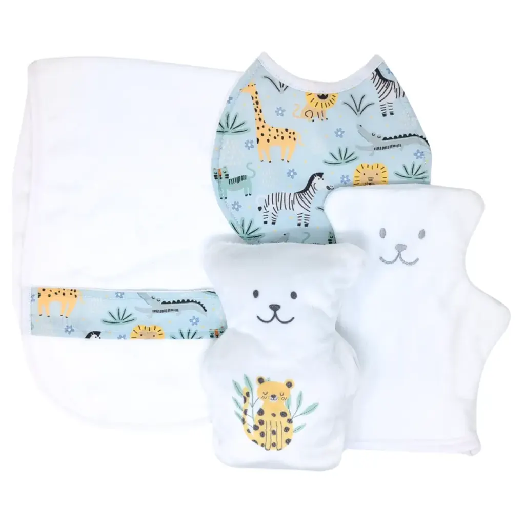 Pensé pour répondre aux besoins des nouveau-nés, cet ensemble contient quatre accessoires incontournables, à la fois pratiques, doux et réconfortants :