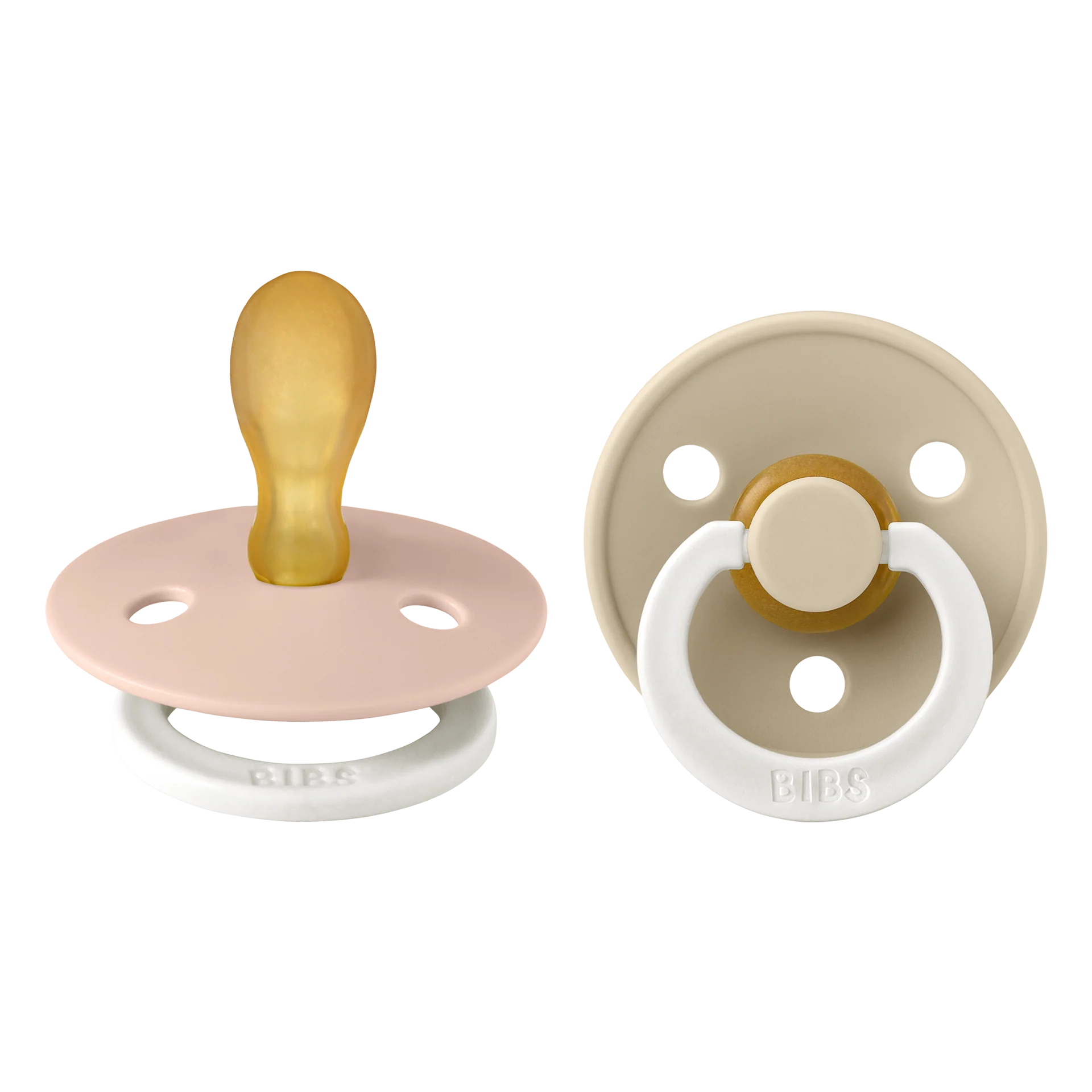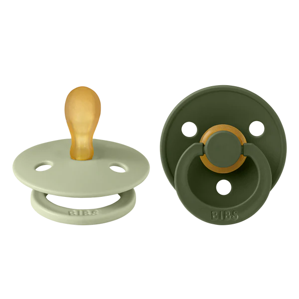 BIBS Color est la sucette BIBS originale et est sur le marché depuis plus de 40 ans. Il a le bouclier rond BIBS avec trois trous d'aération et un anneau de poignée rond gravé BIBS. Le mamelon de forme anatomique est incurvé en haut pour un ajustement naturel au palais du bébé avec une pointe inclinée pour un placement facile de la langue.