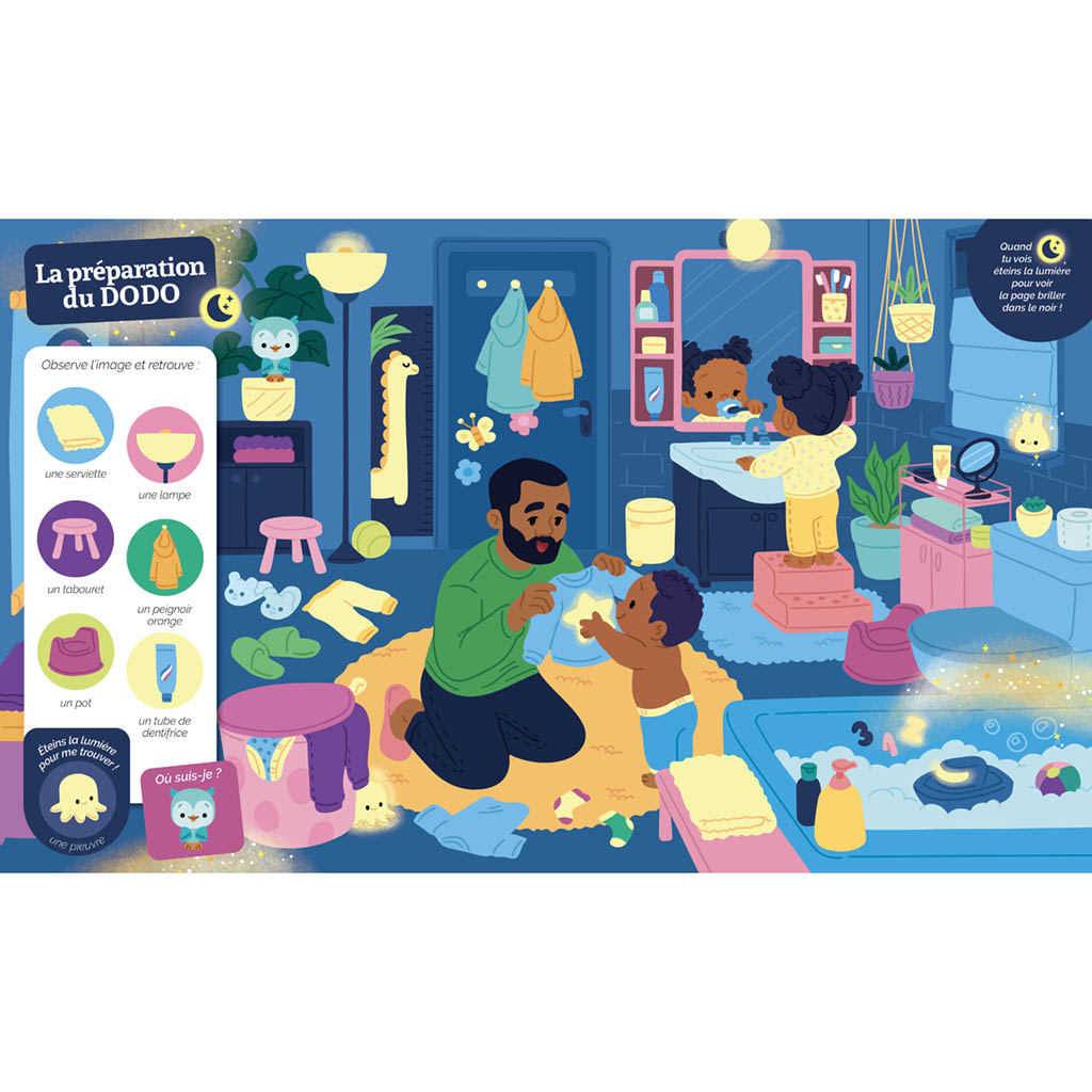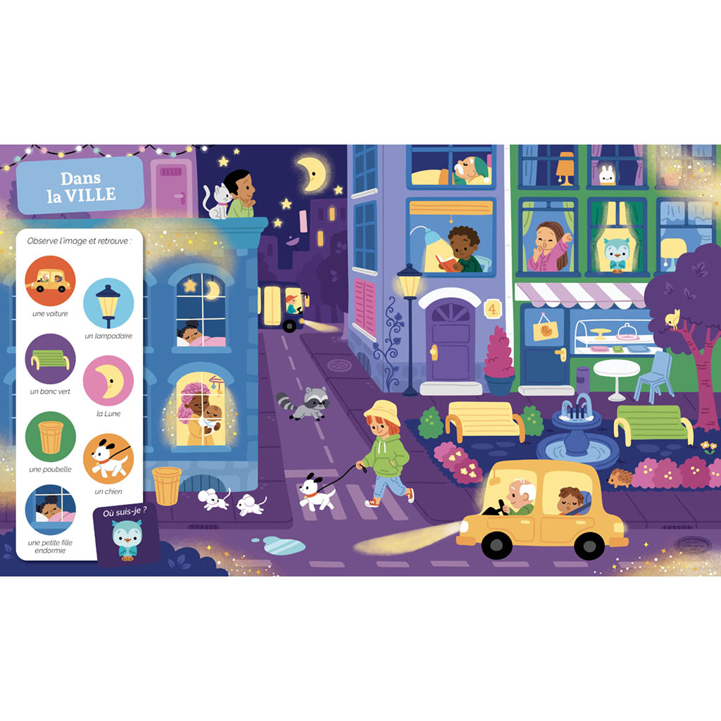 Ils observent attentivement et retrouvent 7 éléments (+ la mascotte) bien cachés sur chaque planche : des animaux endormis, des étoiles filantes, Peter Pan ou le marchand de sable apparaissent au fil des pages.Du vernis phosphorescent permet de retrouver des éléments cachés dans le noir !
