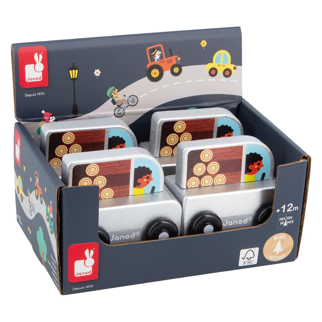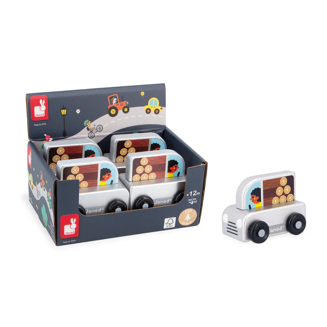 Fabriqué en bois certifié FSC®, il mesure 7 x 4,5 x 5,5 cm et est doté de roues en plastique. Ce jouet fait partie de la collection Cross Roads, une série de véhicules en bois compatibles avec les tapis de jeu de la même gamme, offrant une expérience ludique et éducative.