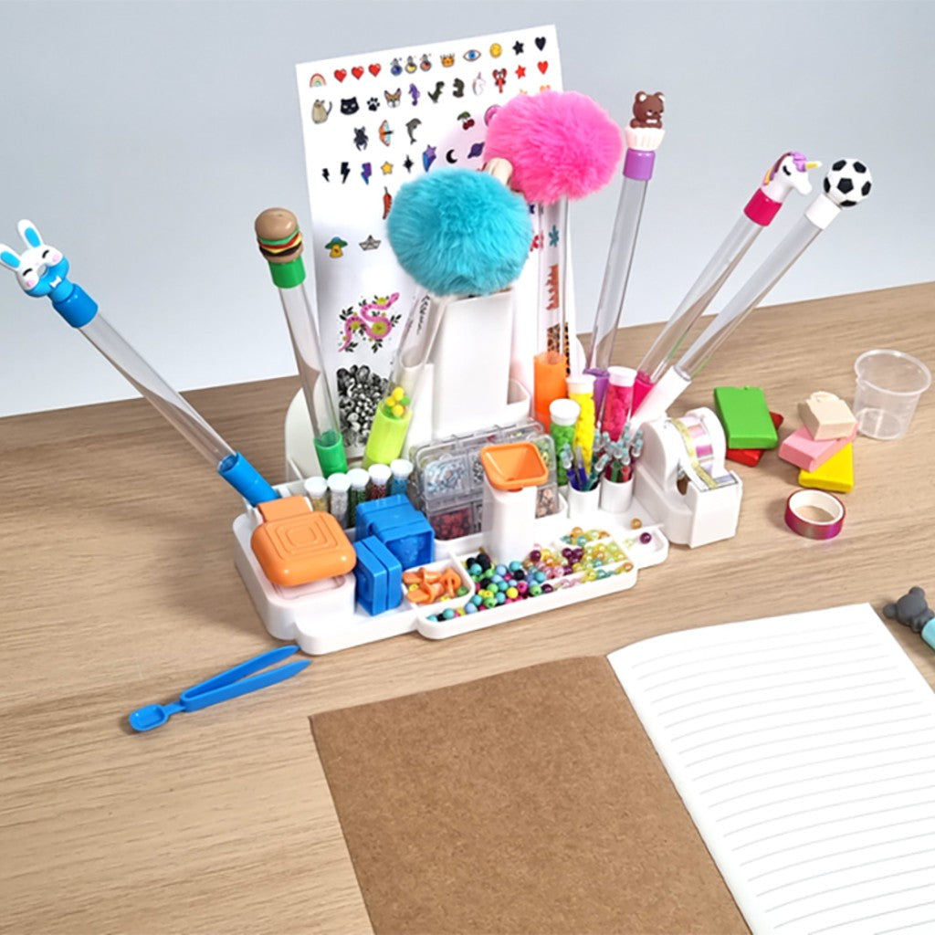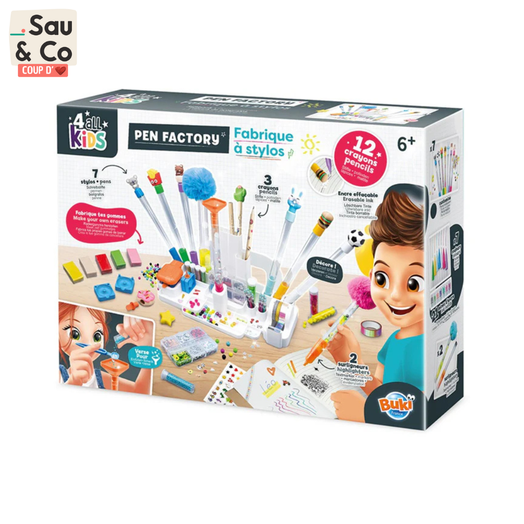 Une station pour personnaliser 12 crayons ainsi que du matériel de bureau selon tes envies ! Place le stylo dans la station, ajoute l’entonnoir et remplis-le avec les décorations de ton choix ! Décore les crayons de papier avec les autocollants et fabrique des gommes à effacer. Personnalise le carnet fourni à l’aide des rouleaux de ruban-cache. Utilise ensuite la station comme organisateur pour ranger tout ton matériel sur ton bureau !