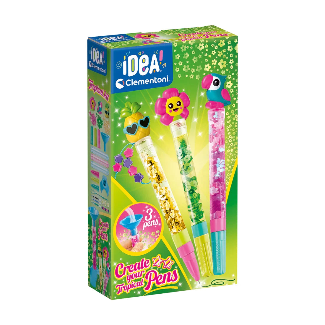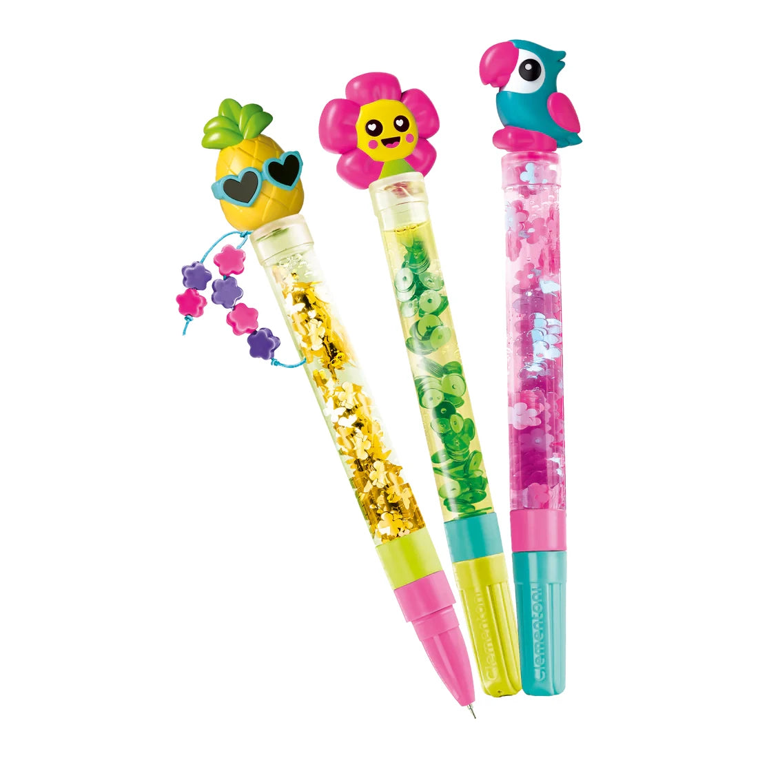 Un coffret créatif original qui permet d'assembler 3 stylos et de les personnaliser avec différentes décorations dans un style tropical. Le coffret contient 3 stylos à assembler, 4 encres de couleurs différentes, 3 personnages et tous les accessoires pour les décorer.
