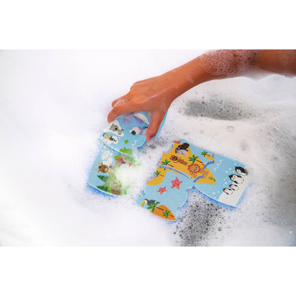 Avec cette carte du monde de 28 pièces à assembler dans le bain, votre enfant va s'amuser à parcourir le monde grâce aux 4 figurines véhicules pour circuler à travers le monde, dans les airs où sous les mers, ... Magique !