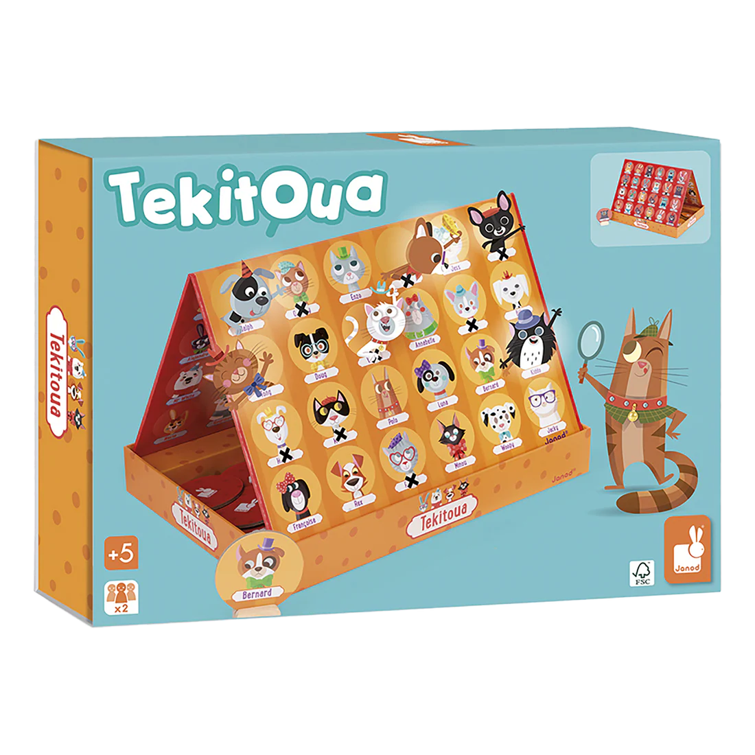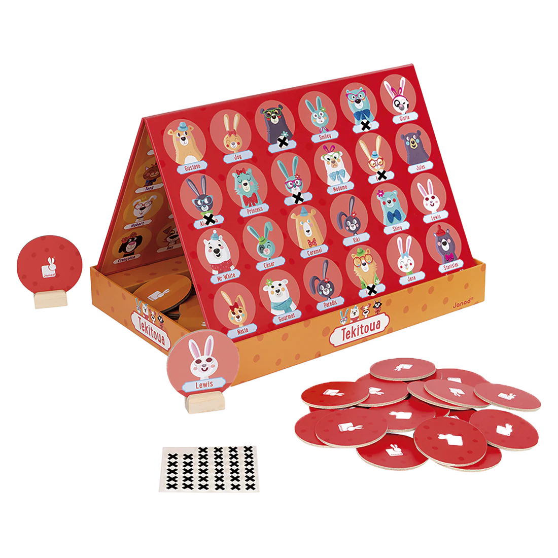 Quel est l’animal de ton adversaire? Pose des questions pour le découvrir et élimine les animaux les uns après les autres en les rayant sur le plateau. Le premier qui a trouvé a gagné ! Ce jeu de stratégie est à la fois tactique et éducatif ! De quoi passer un bon moment ! Plateau réversible pour 2 niveaux de jeux. Inclus 48 stickers repositionnables et 48 cartes (24 par niveau). Jeu en carton.