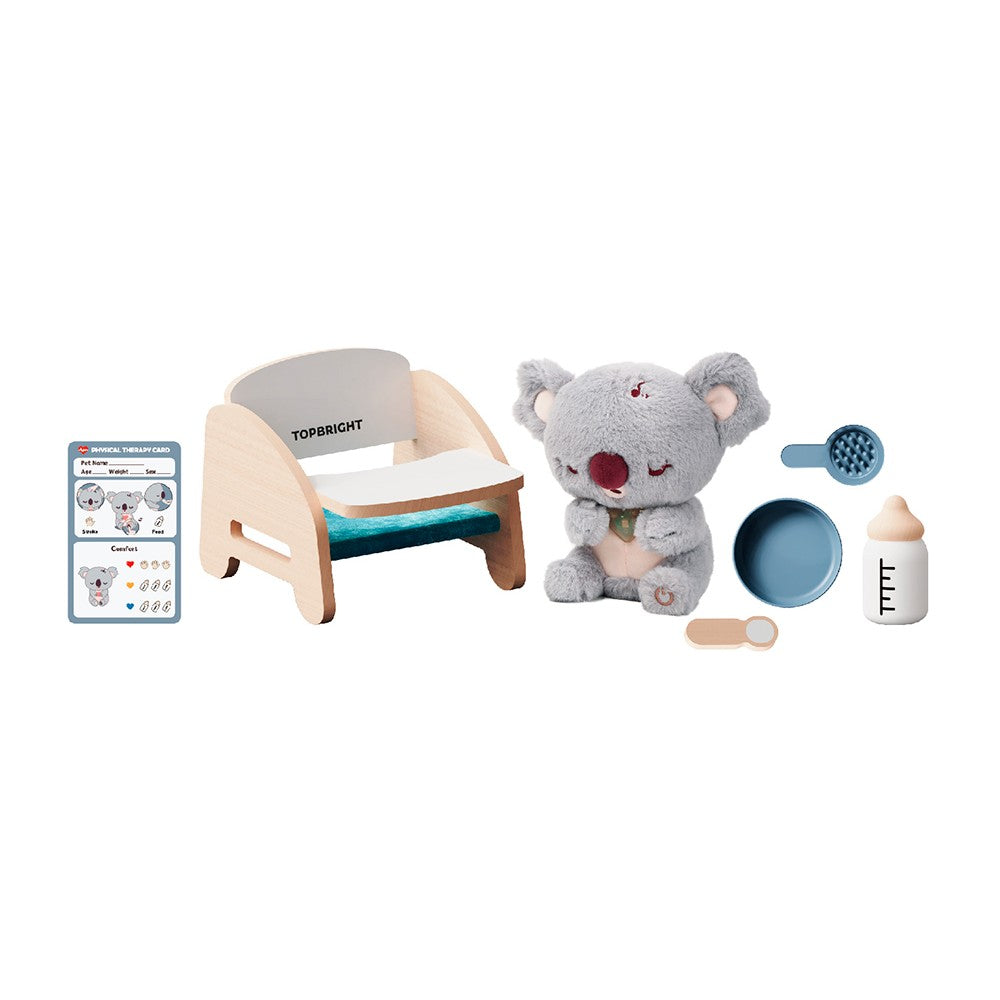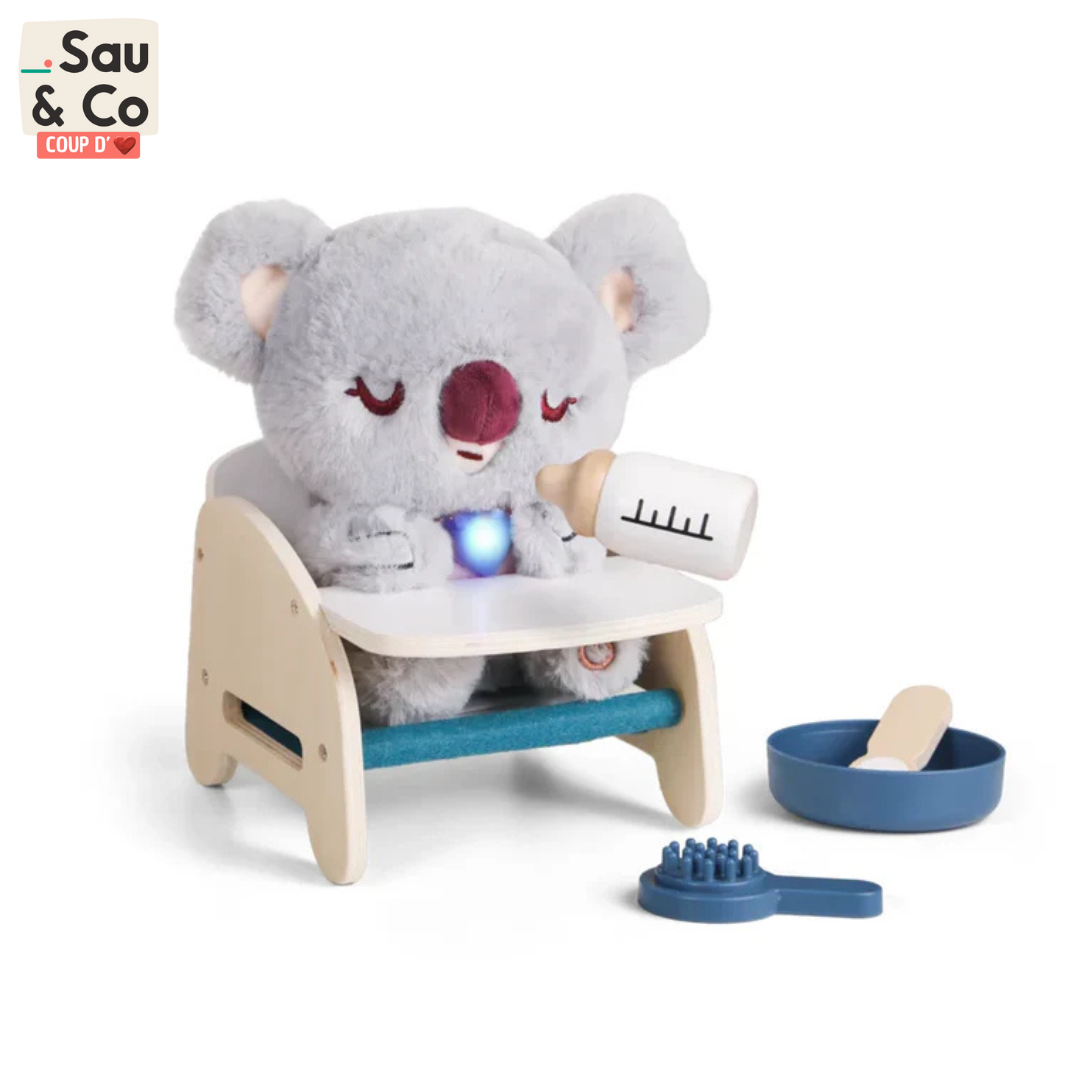 Avec bébé koala, les enfants de 36 mois et plus peuvent découvrir le plaisir de prendre soin de quelqu'un. La peluche koala interactive utilise un cœur lumineux pour montrer ce qu'il ressent : de la mauvaise humeur, de la fatigue, de la faim ou simplement de la joie. Les enfants s'occupent des besoins de bébé koala en utilisant la carte de diagnostic, en lui faisant des caresses affectueuses et en lui donnant quelques gorgées de son biberon interactif. Avec des effets de lumière, de son et beaucoup d'émotions, les enfants développent de manière ludique leur empathie, leur patience et leur sens de l'attention. bébé koala les aide à acquérir des compétences sociales, à être à l'écoute des autres et à renforcer leur confiance en eux. Car ceux qui peuvent aider se sentent forts et nécessaires. Un compagnon interactif avec un cœur qui montre de façon ludique à quel point il est important d'être là les uns pour les autres.