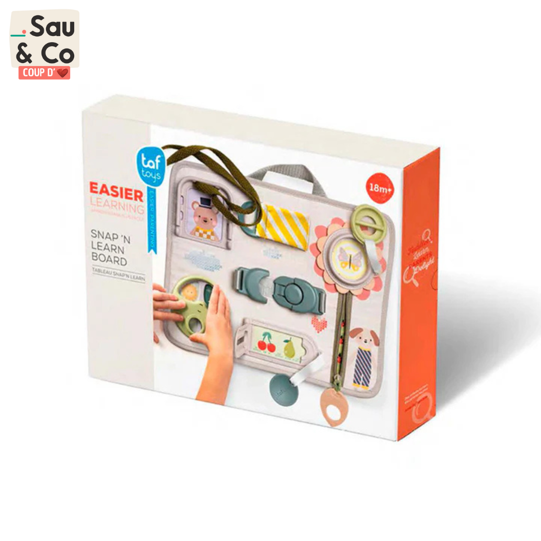 Le tableau Snap 'n Learn est un jouet interactif pour les enfants de 18 mois et plus. Il comporte des lacets à attacher avec un ours qui fait un clin d'œil, un disque de découverte rotatif avec une fleur et un écureuil qui font un clin d'œil, et un verrou à tourner qui révèle un papillon qui fait un clin d'œil. La boucle centrale permet aux tout-petits d'exercer leur motricité et d'explorer les réactions sonores. De plus, la fermeture à glissière avec une feuille et le bouton-pression coulissant qui permet de faire un clin d'œil aux enfants favorisent la motricité et la compréhension de la relation de cause à effet.