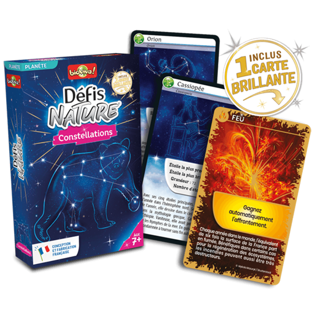 Défis Nature - Constellations vous invite à explorer les mystères des constellations ! Découvrez leurs histoires exceptionnelles, puis pariez sur leurs points forts pour collecter toutes les cartes du jeu et remporter la partie. Alors, prêts à relever le défi ? Le principe de