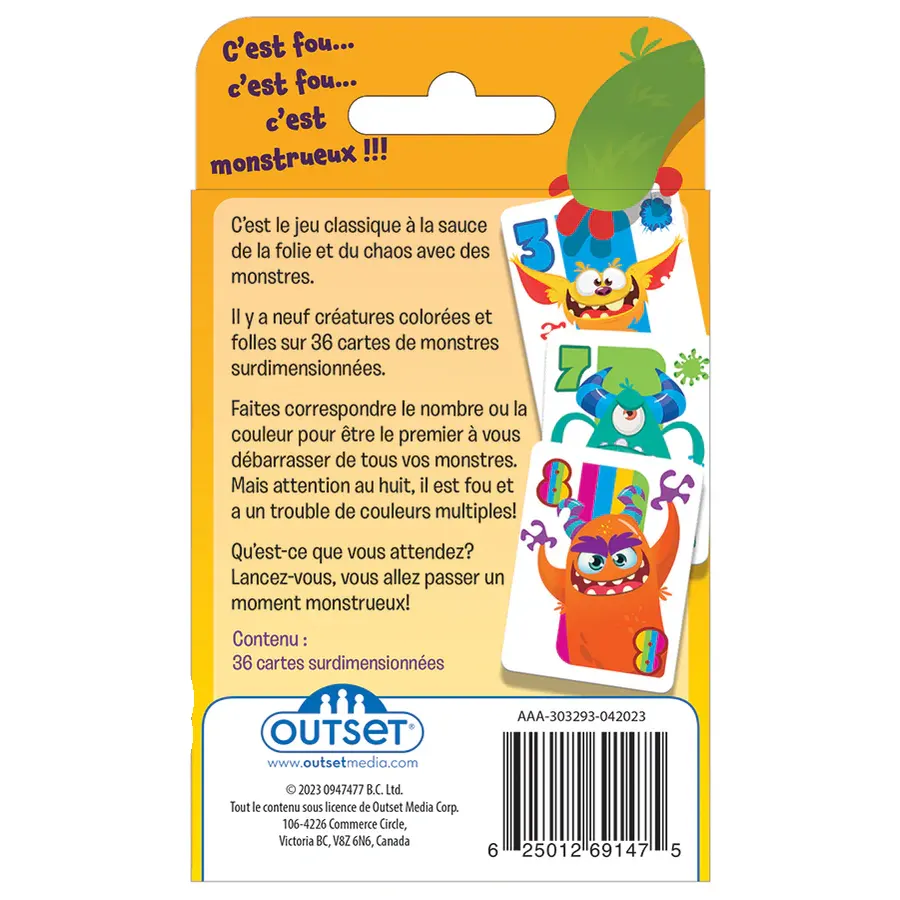 C'est le jeu classique a la sauce de la folie et du chaos avec des monstres. Ily y a neuf creatures colorees et folles sur 36 cartes de monstres surdimensonnees. Faites correspondre le nombre ou la couleur pour etre le premier a vous debarrasser de tous vos monstres. Mais attention au huit, il est fou et a un trouble de couleurs multiples!