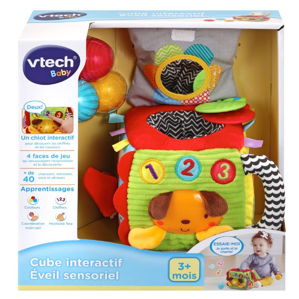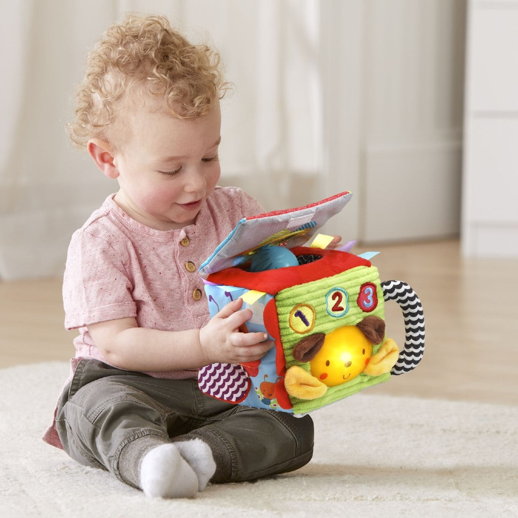 - Avec un détecteur de mouvement, des boutons et un chiot interactif, le cube d'activités éveille la curiosité des tout-petits avec des sons, des phrases et des chansons amusantes.