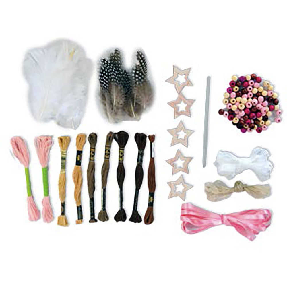 Dans cette boite cadeau, retrouve tout le nécessaire pour réaliser 3 attrapes rêves géants grâce aux nombreux accessoires fournis : 1 planche imprimée pré-découpée, 3 morceaux de rotin, 1 crochet , ficelle, plumes, fils de coton (4 coloris), rubans (3 coloris), dentelle, perles bois (4 coloris), perles variées, pendentifs bois, 1 aiguille et 1 livret d’instructions.