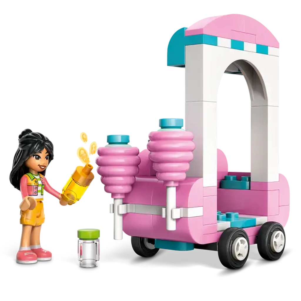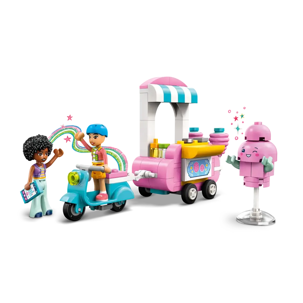 Les filles, les garçons et tous les petits bricoleurs qui aiment le jeu créatif peuvent s’amuser à inventer leurs propres histoires avec cet ensemble. Il raconte l’histoire de Liann et Jamila, qui aiment passer du temps ensemble au kiosque de barbe à papa. Le véhicule LEGO remorque le chariot à roulettes, qui est livré avec un bol et des garnitures pour créer les délices de barbe à papa. Il y a aussi une caisse enregistreuse et des accessoires pour que les enfants puissent jouer différents rôles lors des interactions avec les clients.