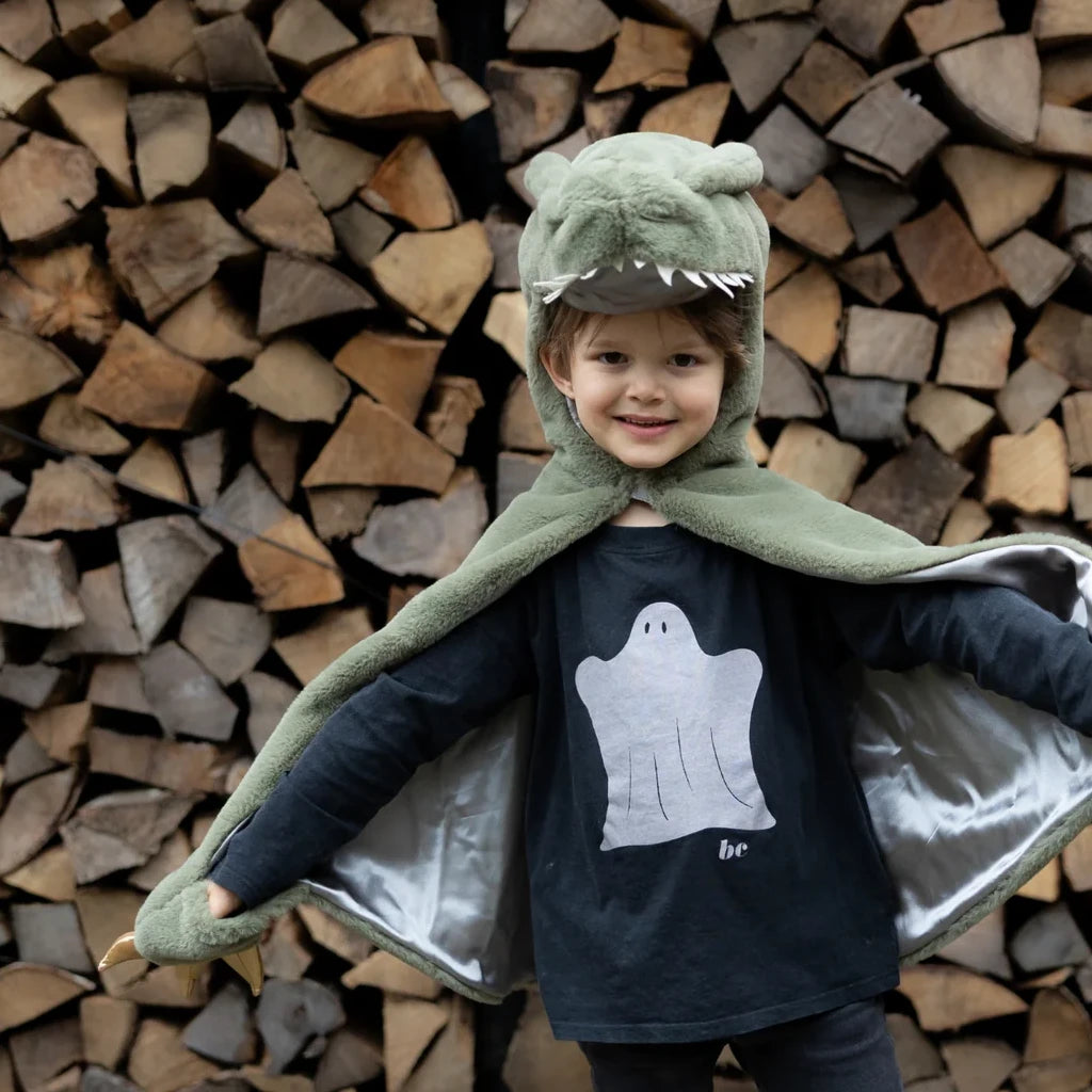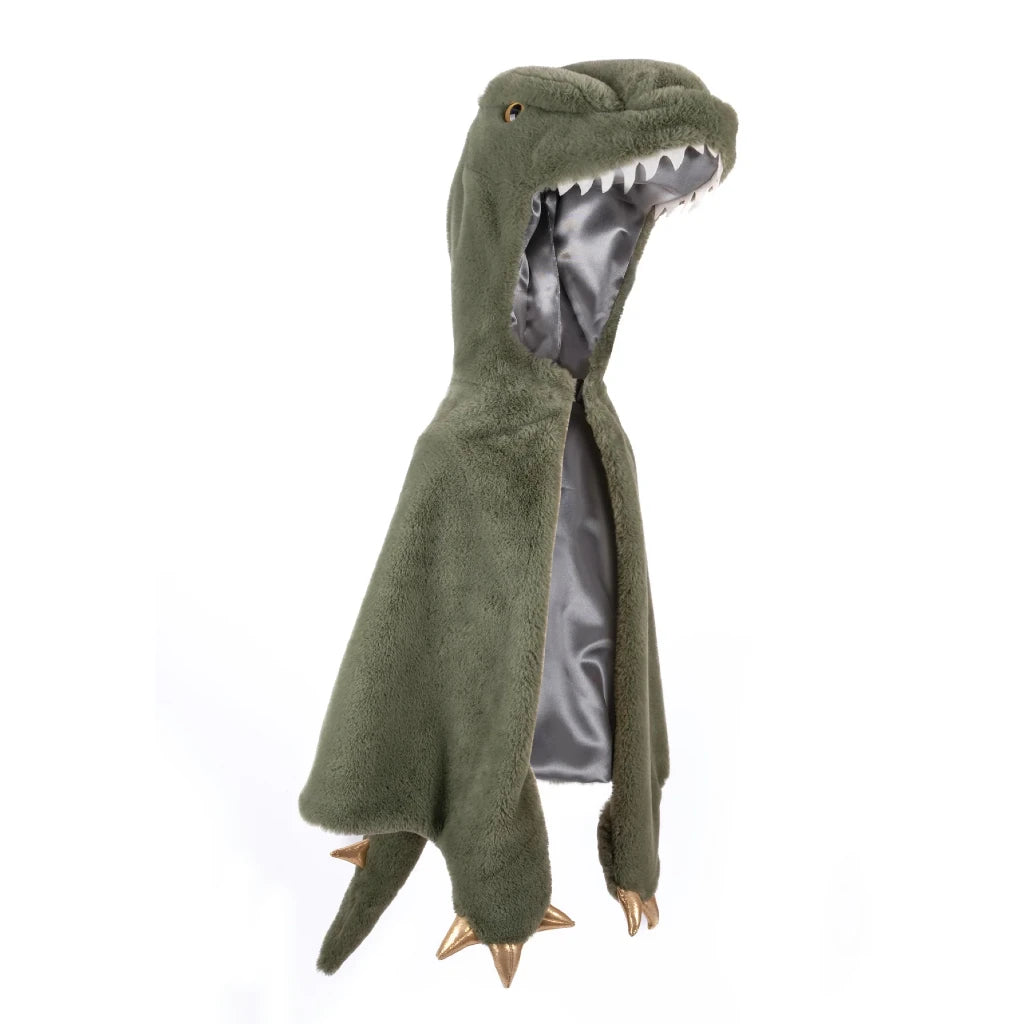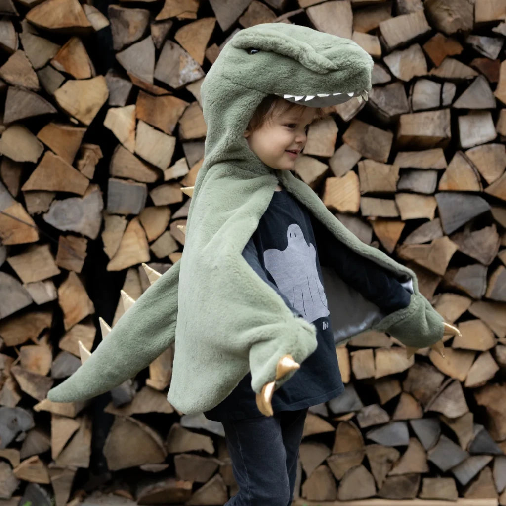 Confectionnée en fourrure vert forêt ultra douce, cette cape audacieuse transforme votre tout-petit en un puissant T-Rex. Sa capuche en peluche a la forme d'une tête de dinosaure, avec ses dents en feutre blanc et ses griffes métalliques dorées étincelantes pour une touche préhistorique supplémentaire.