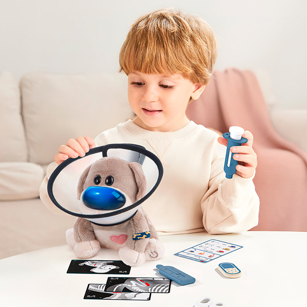 Ce kit interactif comprend un chiot en peluche réactif avec des lumières, des sons et des symptômes réalistes qui évoluent avec le temps. Les enfants peuvent soigner leur ami à fourrure à l'aide d'outils amusants tels qu'un stéthoscope, une seringue, un thermomètre et une carte de diagnostic, créant ainsi une véritable expérience pratique. L'ensemble comprend une carte de diagnostic colorée qui apprend aux enfants à faire correspondre les symptômes aux traitements. En suivant la carte, ils apprennent la logique, l'observation et le séquençage d'une manière amusante et captivante. Les enfants peuvent diagnostiquer l'état de leur chiot en peluche à l'aide de lumières qui changent de couleur. Nez bleu? C'est un rhume! Utilisez le faux médicament inclus pour l'aider à se sentir mieux. Parfait pour enseigner l'empathie et les notions élémentaires de santé par le biais d'un jeu interactif. La seringue sans danger pour les enfants incluse permet aux petits de faire des « piqûres » ludiques dans le cadre de la routine de guérison. Qu'il s'agisse d'un rhume ou d'un problème cardiaque, l'utilisation de la seringue fait partie d'un processus de traitement gratifiant qui enseigne la relation de cause à effet. Le stéthoscope robuste et adapté aux enfants permet aux jeunes médecins d'écouter les battements de cœur de leur chiot. C'est un excellent moyen d'encourager la curiosité à l'égard du corps, tout en favorisant les jeux de rôle et la motricité fine. C'est un mélange parfait de jeu imaginatif, de développement émotionnel et d'apprentissage précoce.