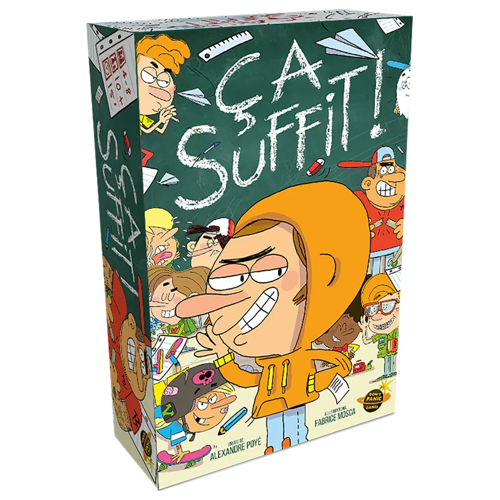Qui a balancé de la nourriture à la cantine ? Qui a dévissé la chaise de la maîtresse ? Qui a enfoncé un chewing-gum dans la serrure ? La maîtresse n'en peut plus, et c'est VOUS qu'elle accuse. Dans un temps imparti que vous ne connaissez pas, utilisez vos cartes pour vous dédouaner et accuser les autres joueurs. Attention, les cartes “personnages” vous permettront d'agir de manière différente sur le jeu ! Le délai mystère est écoulé et c'est à votre tour ? Et bien, petit plaisantin, vous êtes puni ! Parce que, hein, ÇA SUFFIT !