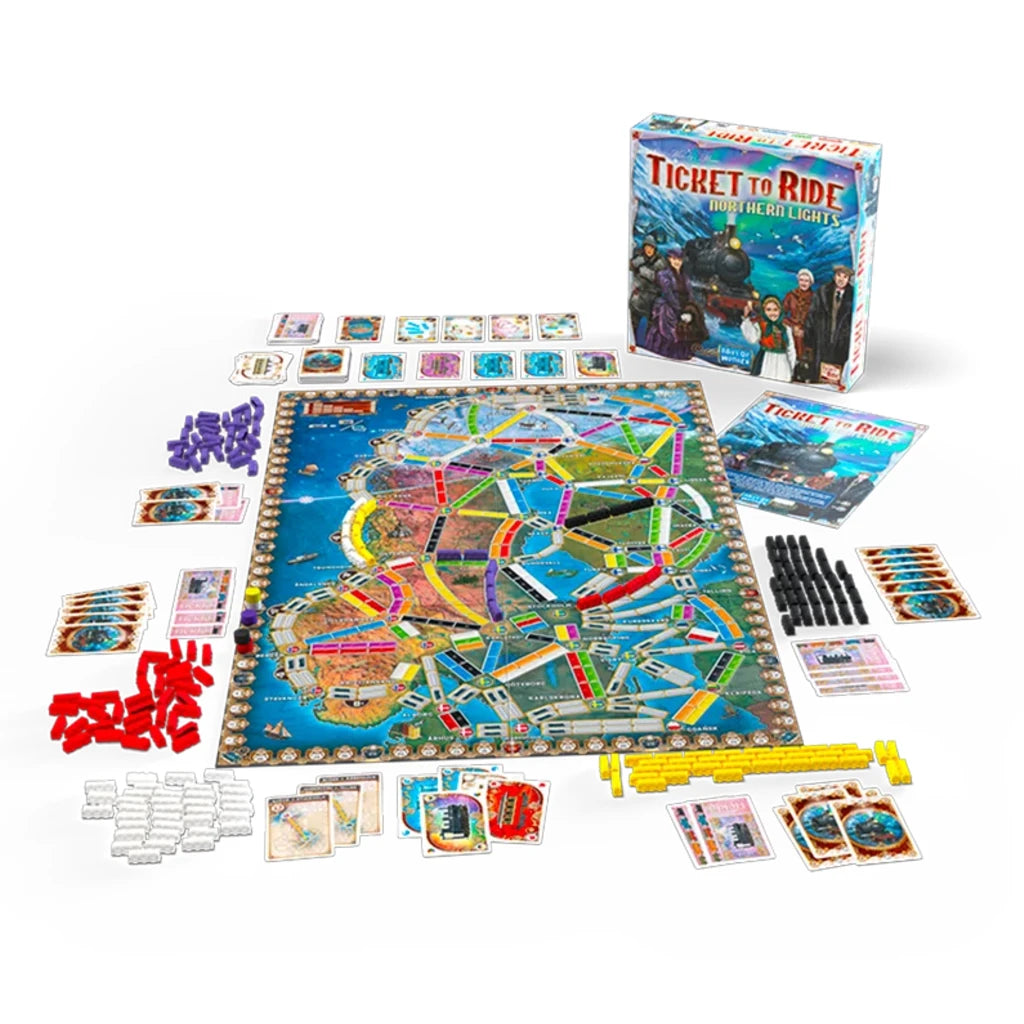Les Aventuriers du Rail™ – Aurores Boréales est une nouvelle version du célèbre jeu d’aventures ferroviaires. Les joueurs utilisent leurs cartes wagon pour prendre possession de voies ferrées ou embarquer à bord d’un ferry, reliant peu à peu les villes qui figurent sur leurs tickets. Ils doivent aussi garder un œil sur les 4 cartes bonus communes sélectionnées au hasard et qui peuvent rapporter de précieux points en fin de partie.