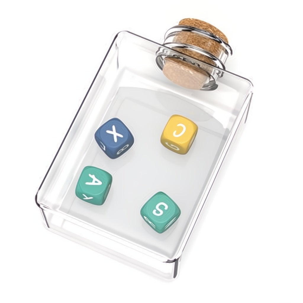 Secouez la bouteille contenant les quatre dés-lettres, puis placez-la au centre de la table, bien en vue de tous les joueurs. La manche commence immédiatement : observez les lettres affichées par les dés et soyez le premier à dire un mot qui contient toutes les lettres ! Si votre mot est correct, prenez 1 diamant.