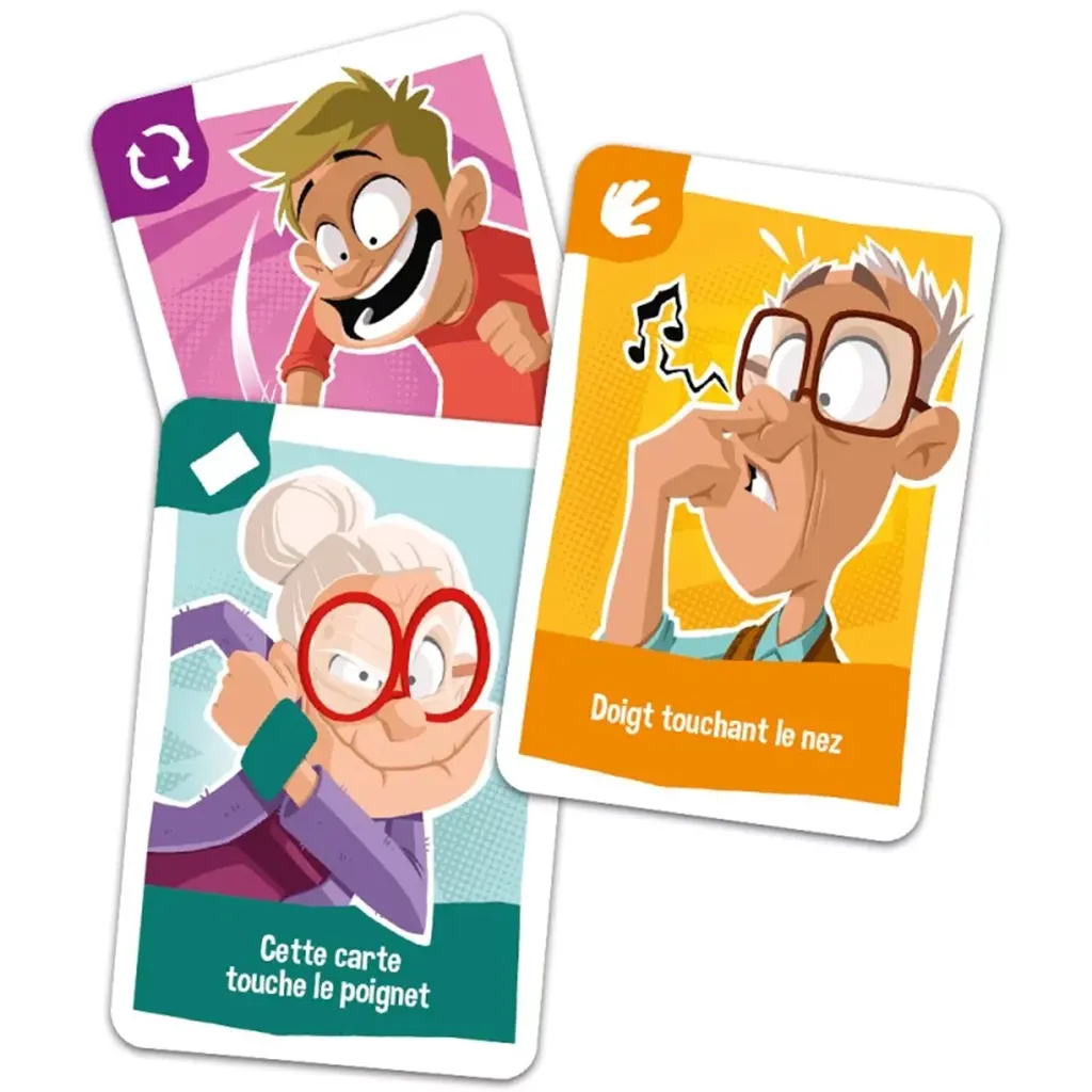 A leur tour, les joueurs piochent une carte et doivent suivre le défi imposé. Par exemple «un doigt touche le nez», «le coude gauche au-dessus de l’épaule», « les deux mains doivent se toucher» ou «cette carte sur votre tête». L’instruction sur la carte doit être suivie pour tout le reste du jeu. Mais les cartes s’accumulent et un joueur qui n’arrive plus à respecter tous ses défis est éliminé. A la fin il n'en restera qu'un !