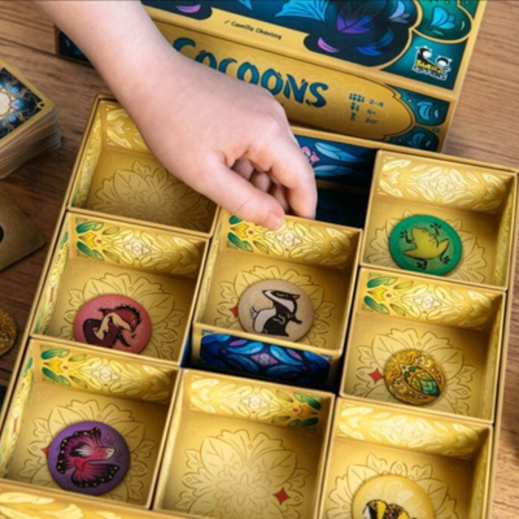 Dans Cocoons, vous devez coopérer pour libérer les gardiens égarés dans la boîte, puis les replacer dans leurs cocons respectifs. À votre tour, dépensez un jeton d'action pour faire glisser un cocon, comme dans un jeu de taquin, et révéler ainsi de nouvelles informations : chaque joueur ne voit que les indices en face de lui, et il faut donc bien communiquer entre vous pour identifier les cocons ! Si vous dévoilez une trappe au fond de la boîte, ouvrez-la pour activer son effet et découvrir l'animal gardien caché dessous. Vous pouvez désormais déplacer ce gardien dans son cocon, si vous l'avez déjà localisé. Une fois que tous les gardiens ont rejoint leur cocon, retrouvez le jeton de départ pour sceller votre victoire. Mais attention : vous devez y parvenir avant d’arriver à court d’actions ! Au fil de vos parties, ajoutez de nouvelles trappes pour des défis de plus en plus relevés !