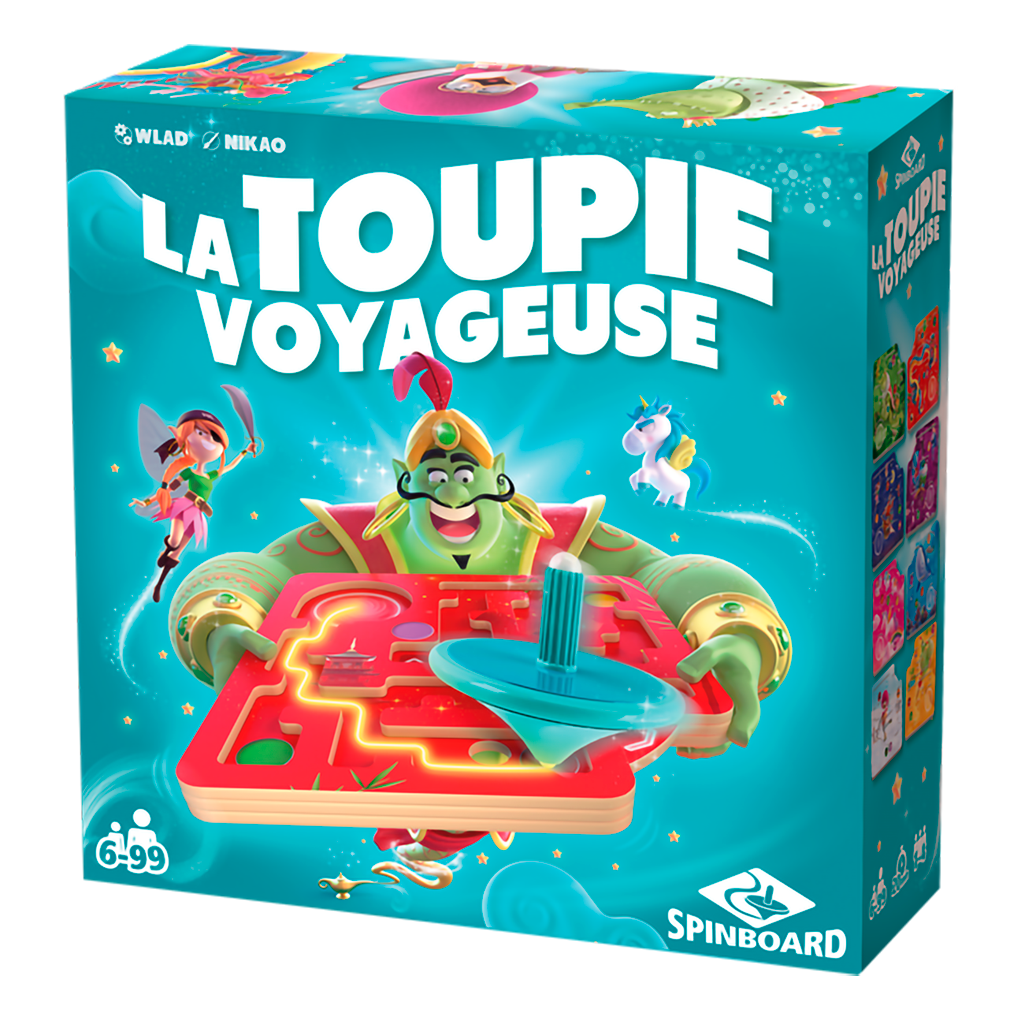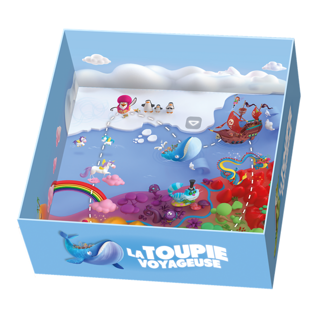 LA TOUPIE VOYAGEUSE est un jeu de parcours de toupie sur 8 mondes merveilleux aux multiples inspirations : crocodile africain, dragon chinois, baleine bleue, fées pirates, Alice au pays des merveilles, lampe d'Aladdin, manchot en roller, et licornes.