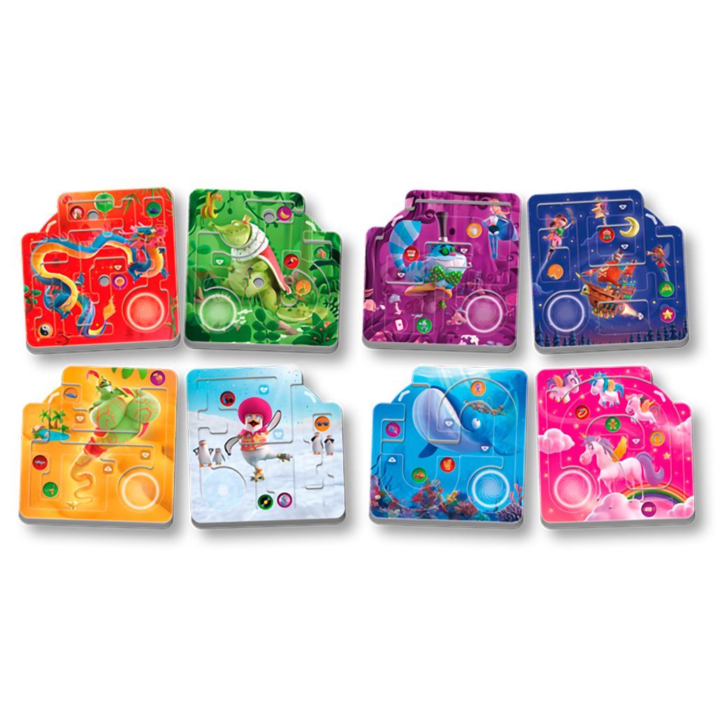 LA TOUPIE VOYAGEUSE est un jeu solo ou coopératif pour tout âge dès 6 ans. Chaque mission représente un parcours que les joueurs vont devoir effectuer avec une toupie en la passant d’un plateau à un autre. Ils représentent 8 mondes merveilleux en relief avec plusieurs cibles.
