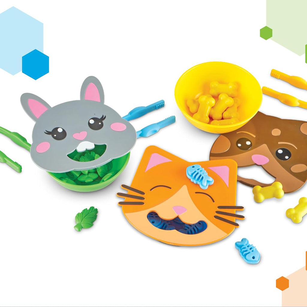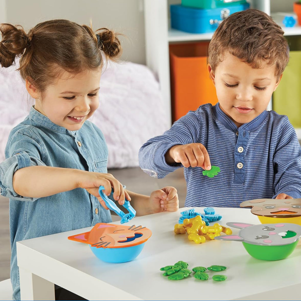 Excellent pour les petits groupes : ce jouet préscolaire est livré avec trois bols, trois décorations d'animaux et trois ensembles de pinces, de sorte qu'il est prêt pour jouer en petit groupe dès la sortie de la boîte