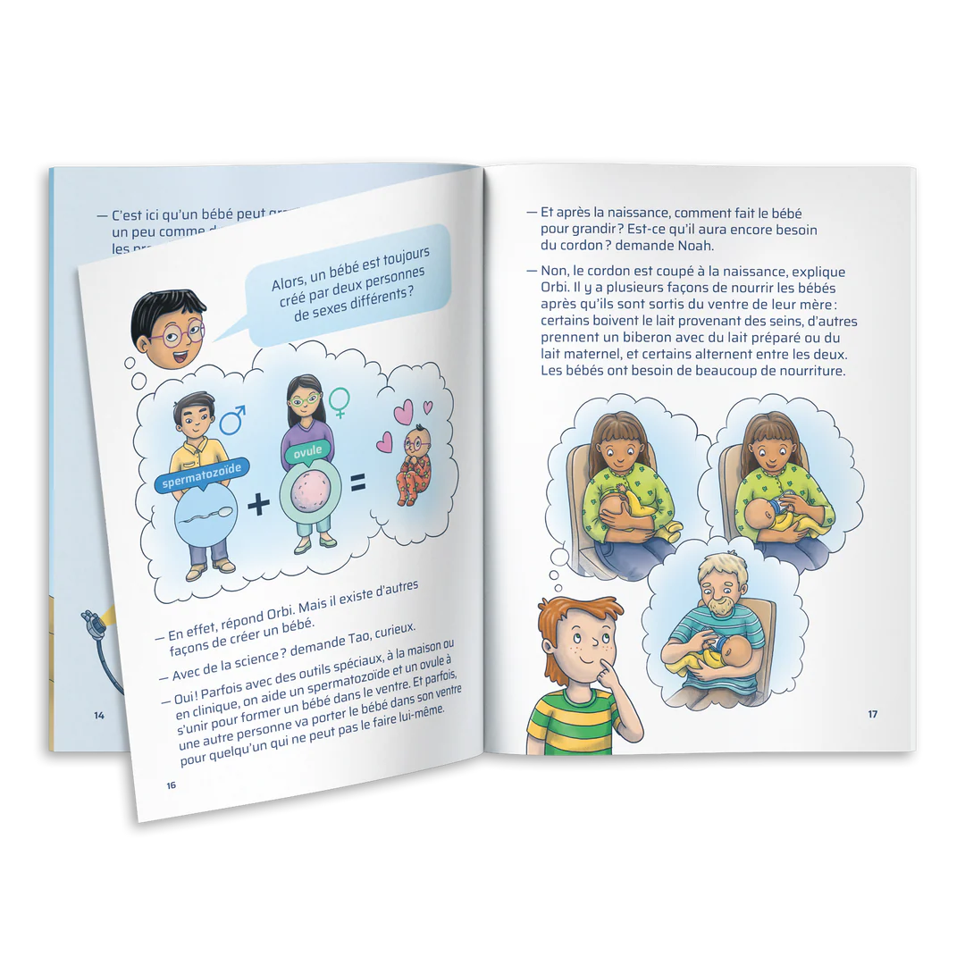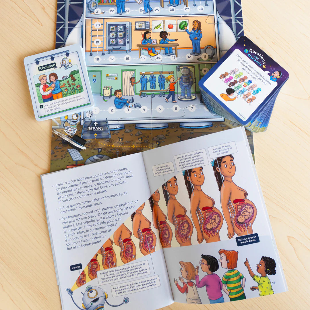 Le jeu comprend un plateau de jeu, 108 cartes-questions et un album illustré qui explique de manière simple et ludique les étapes de la reproduction aux enfants.