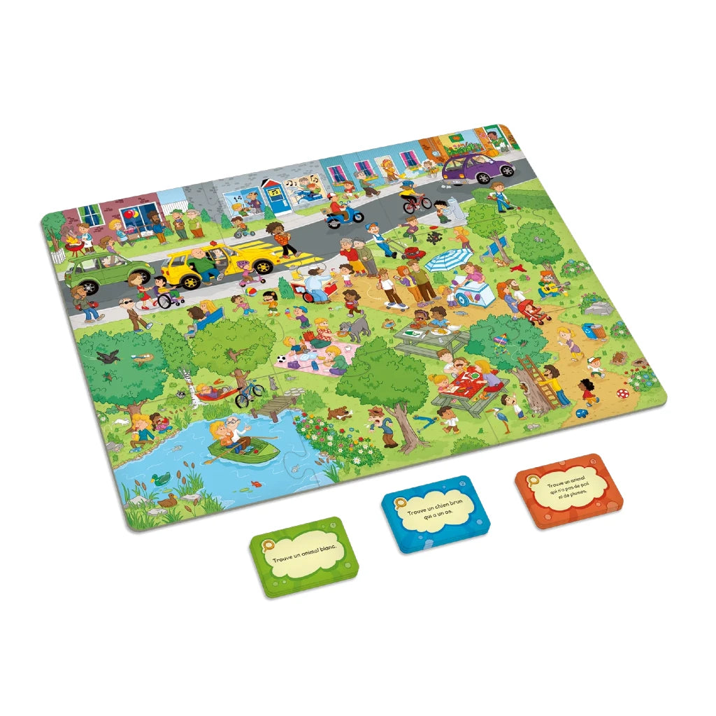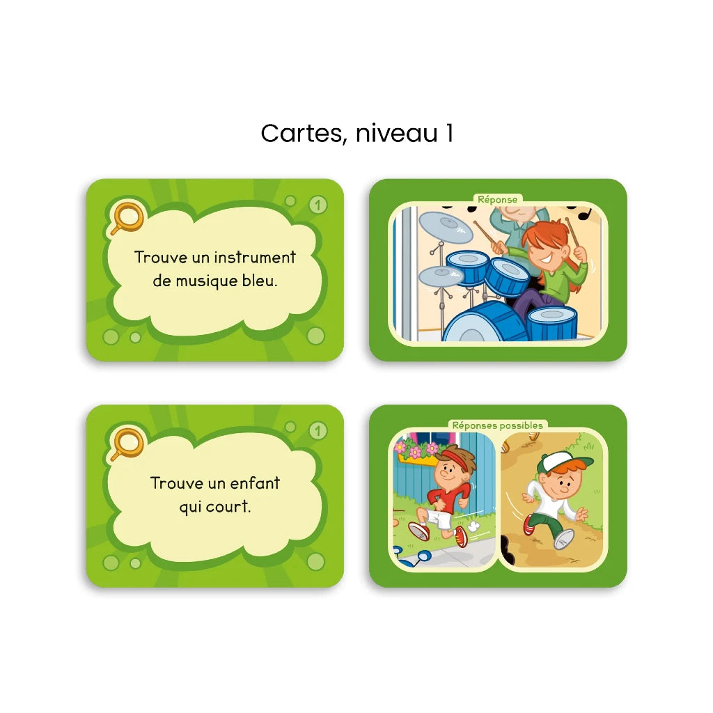 Trouve un animal blanc! Trouve un objet bleu qui sert à s'assoir! Trouve un aliment jaune qui n'est pas un fruit! Écoute bien les consignes et sois le plus rapide à trouver les éléments sur la planche de jeu.