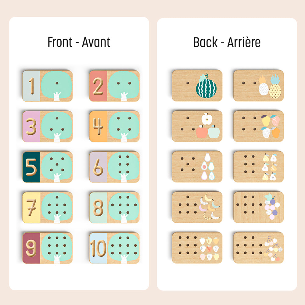 Cet ensemble éducatif 2-en-1, conçu pour les enfants de 3 ans et plus, allie la joie de compter à l'art de tracer les nombres. Avec ses chevilles en forme de pomme et son pommier pittoresque, il jette les bases d'un apprentissage précoce des mathématiques tout en renforçant la créativité et les capacités cognitives. D'un côté, l'enfant peut tracer les nombres de manière tactile avec un crayon de bois ou remplir les points avec des chevilles de pomme pour une leçon de comptage amusante. De l'autre côté, les enfants explorent différentes formes de fruits, comptent les espaces et placent les chevilles de pommes en conséquence. C'est une façon ludique de renforcer les capacités de comptage et d'identification des formes.