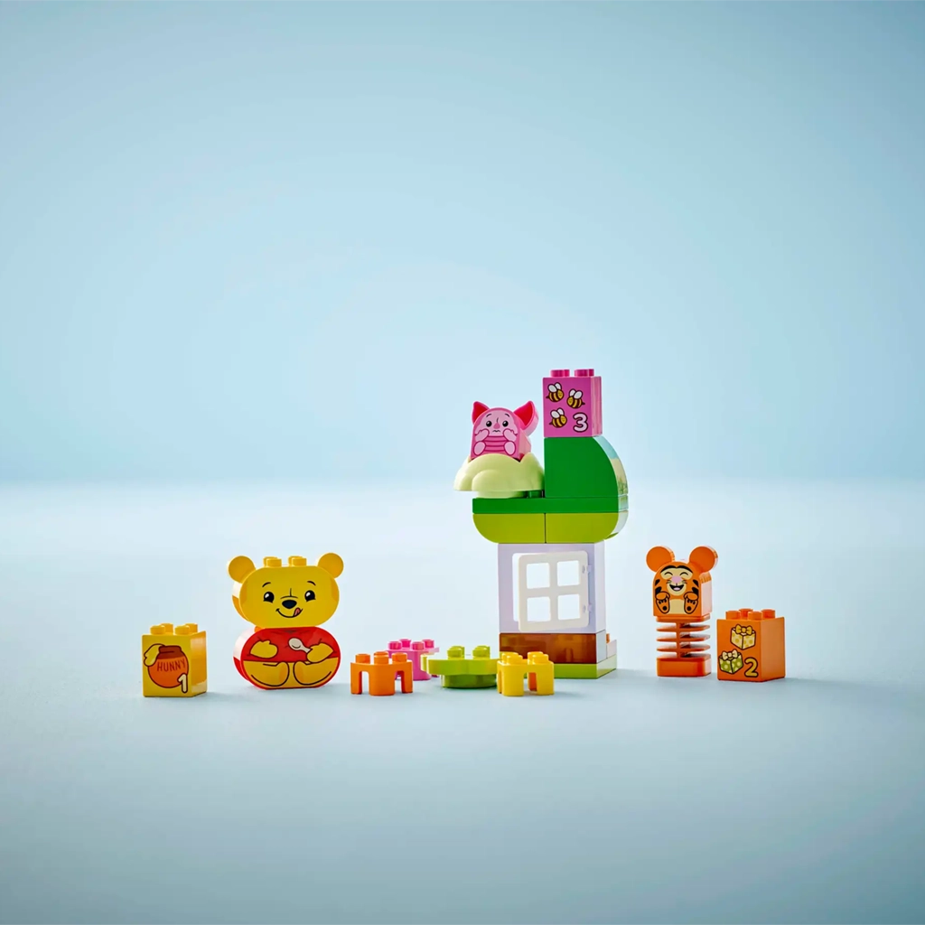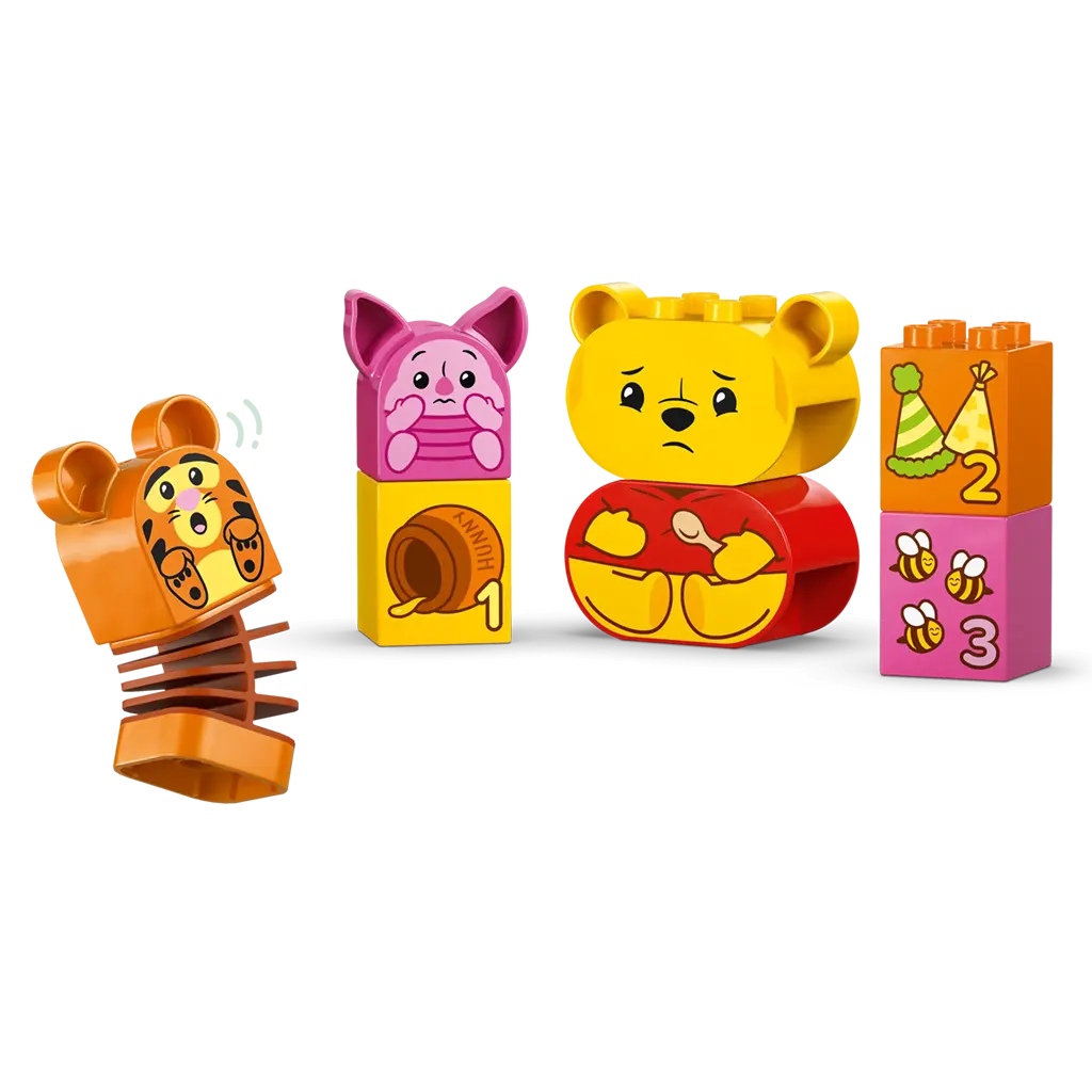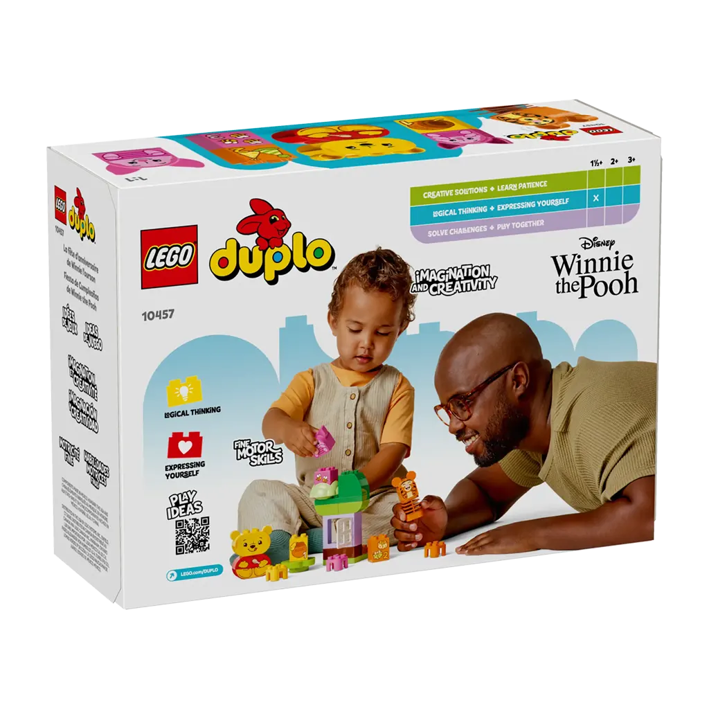 Les parents et les tout-petits profitent de jeux créatifs et apprennent en jouant avec l’ensemble de construction LEGO® DUPLO® ǀ Disney La fête d’anniversaire de Winnie l’ourson . Ce jouet de construction éducatif coloré aide les tout-petits âgés de 18 mois et plus à mettre en pratique leurs compétences précoces tout en profitant d’un jeu imaginatif.