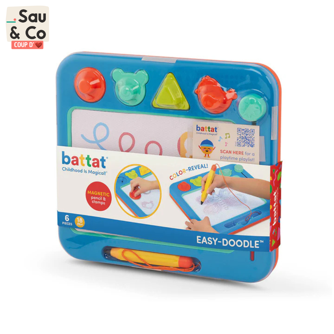 Découvrez un tableau d'art magnétique avec un effet magique révélateur de couleurs : le Easy-Doodle de Battat ! Ce tableau de dessin classique offre aux enfants plusieurs façons de dessiner. Ils peuvent dessiner librement avec le gros crayon ou choisir parmi les 4 formes de tampons pour créer de superbes œuvres ! Quelle que soit la manière dont les enfants choisissent de dessiner, le tableau révélera des couleurs éclatantes au fur et à mesure qu'ils créent leurs mini chefs-d'œuvre. Lorsqu'ils sont prêts pour une nouvelle création, il suffit de faire glisser le bouton pour effacer le dessin existant ! Ce jouet de dessin pour enfants est coloré, durable, et le crayon est attaché au tableau pour ne pas se perdre. Créer des œuvres d'art stimule la créativité, encourage l'expression de soi et développe la motricité fine.