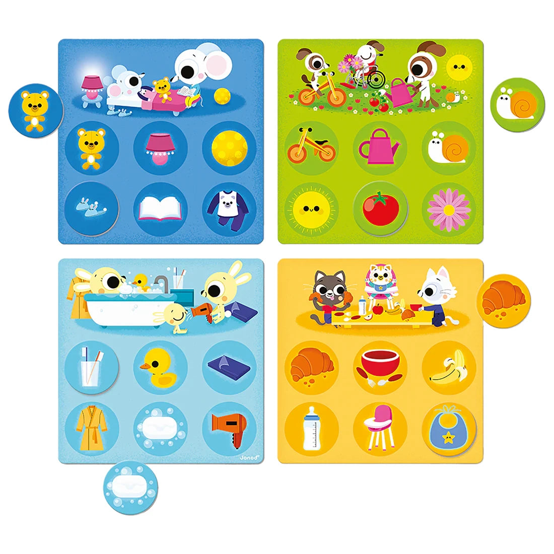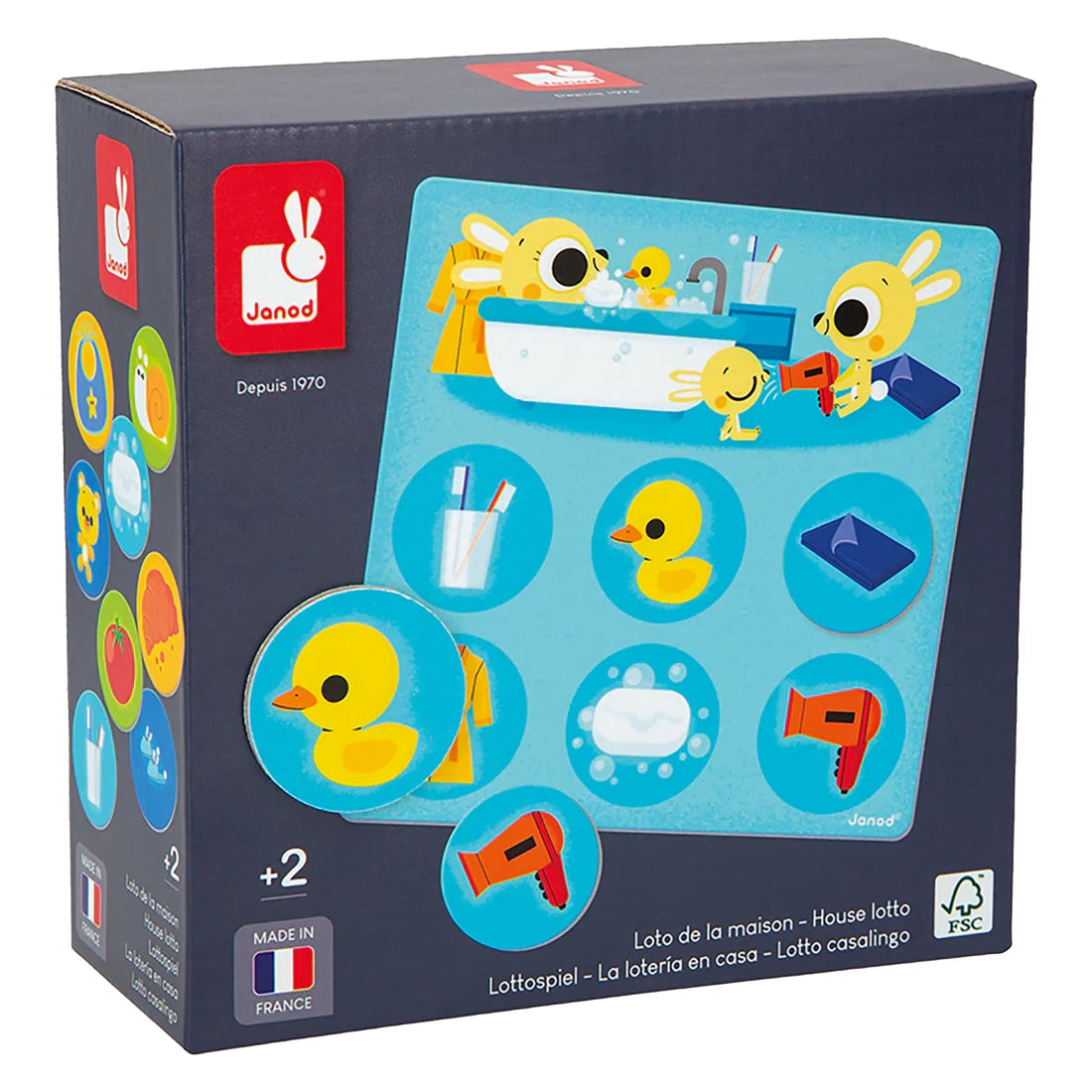 Le Loto de la Maison de Janod est un jeu éducatif en carton conçu pour les enfants dès 2 ans. Ce jeu revisité du loto comprend 4 planches représentant différentes pièces de la maison : la cuisine, la salle de bain, la chambre et le jardin. Les enfants doivent placer les 24 jetons illustrés sur les éléments correspondants de chaque pièce, stimulant ainsi leur observation, leur vocabulaire et leur mémoire.