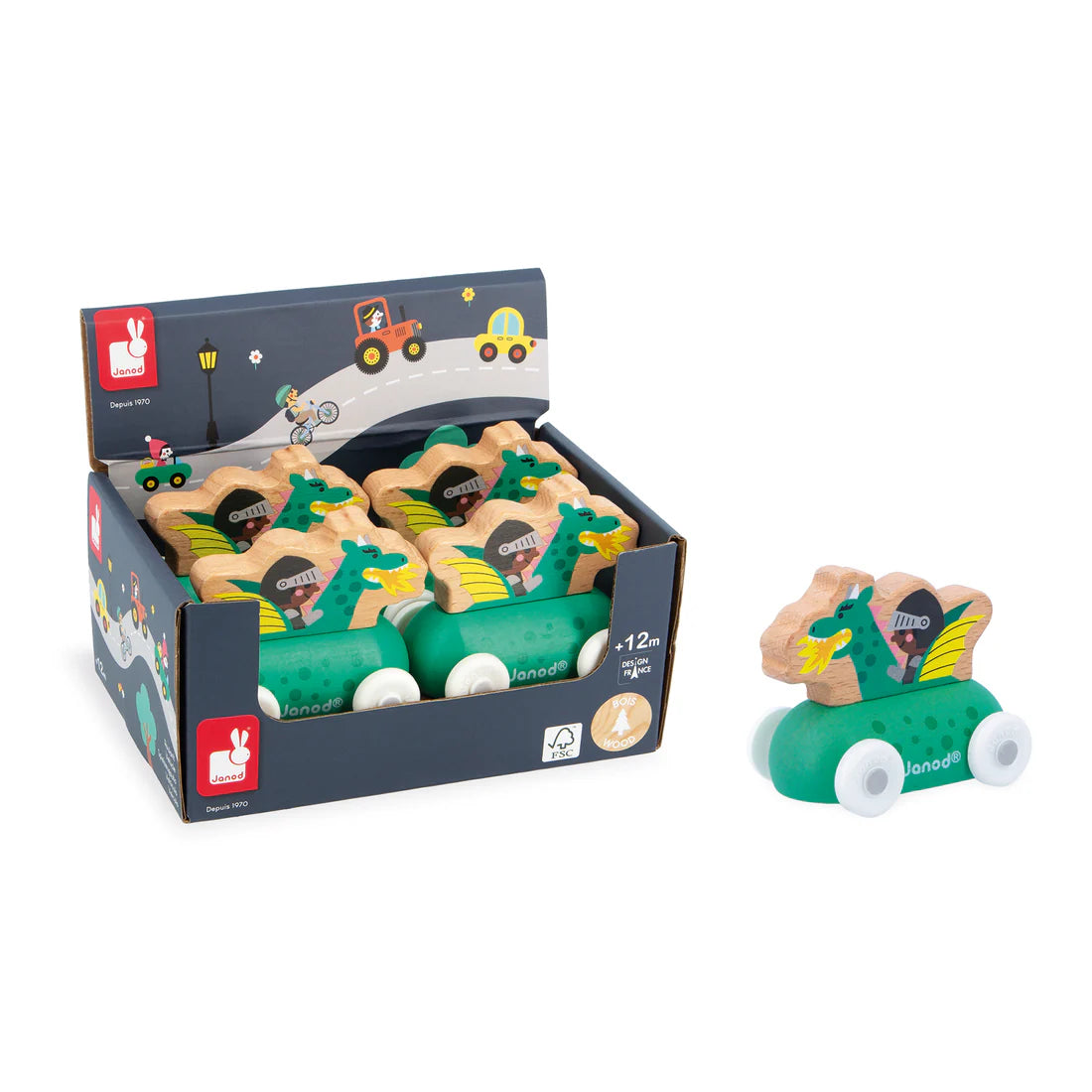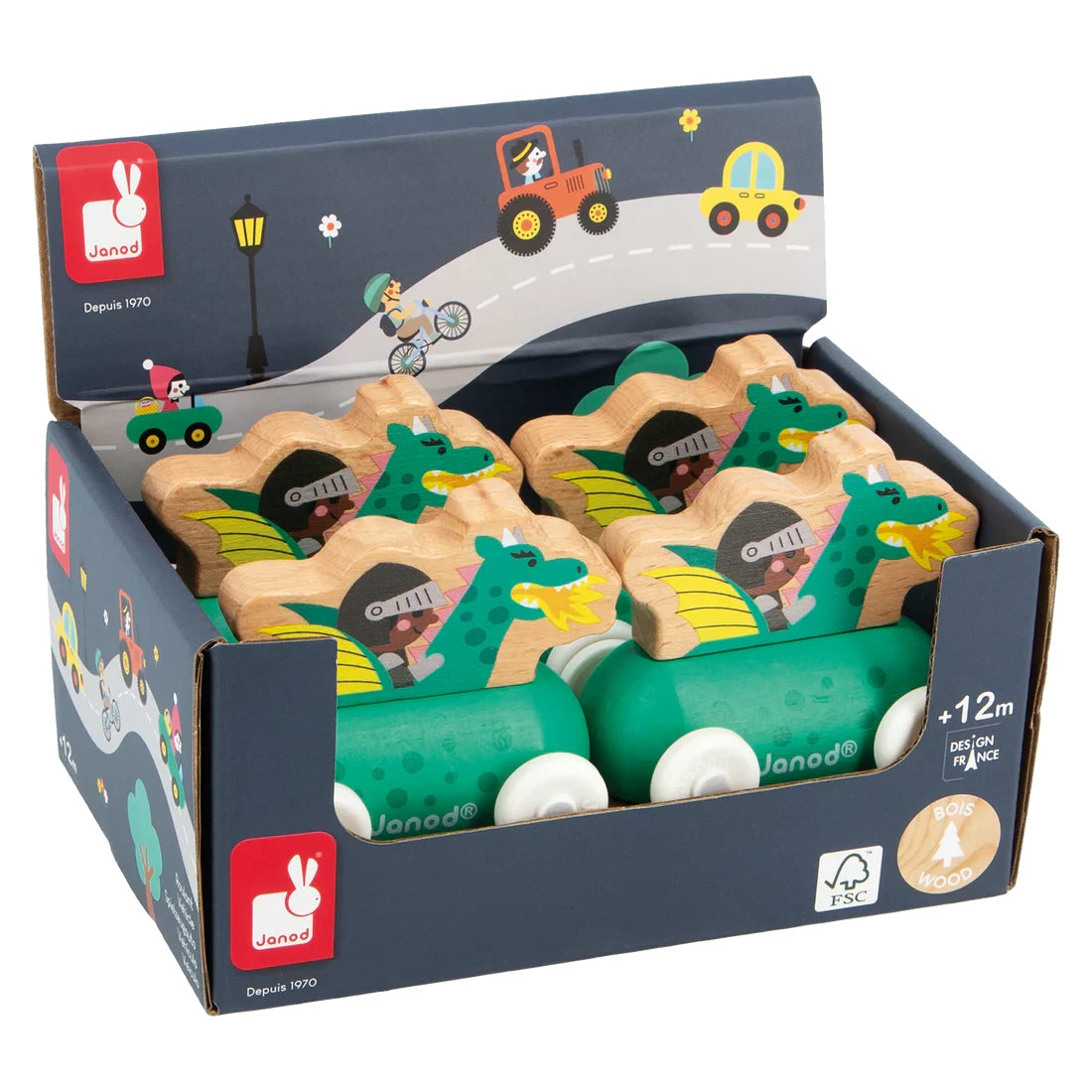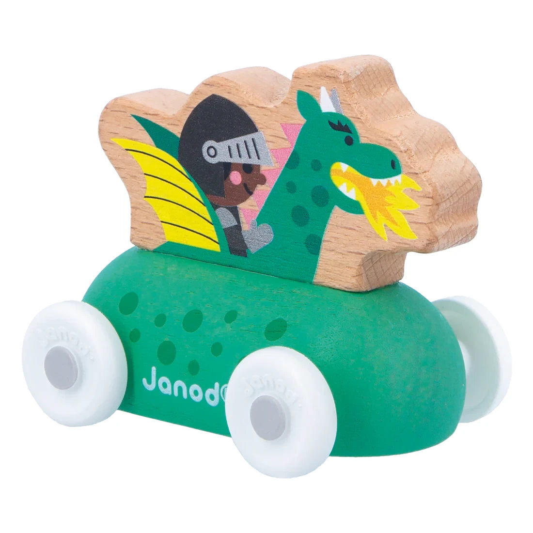 Fabriquée en bois certifié FSC®, elle mesure 7 x 4,5 x 5,5 cm et est dotée de roues en plastique. Ce jouet fait partie de la collection Royaume Enchanté de Janod, une série de véhicules en bois compatibles avec les tapis de jeu de la même gamme, offrant une expérience ludique et éducative.
