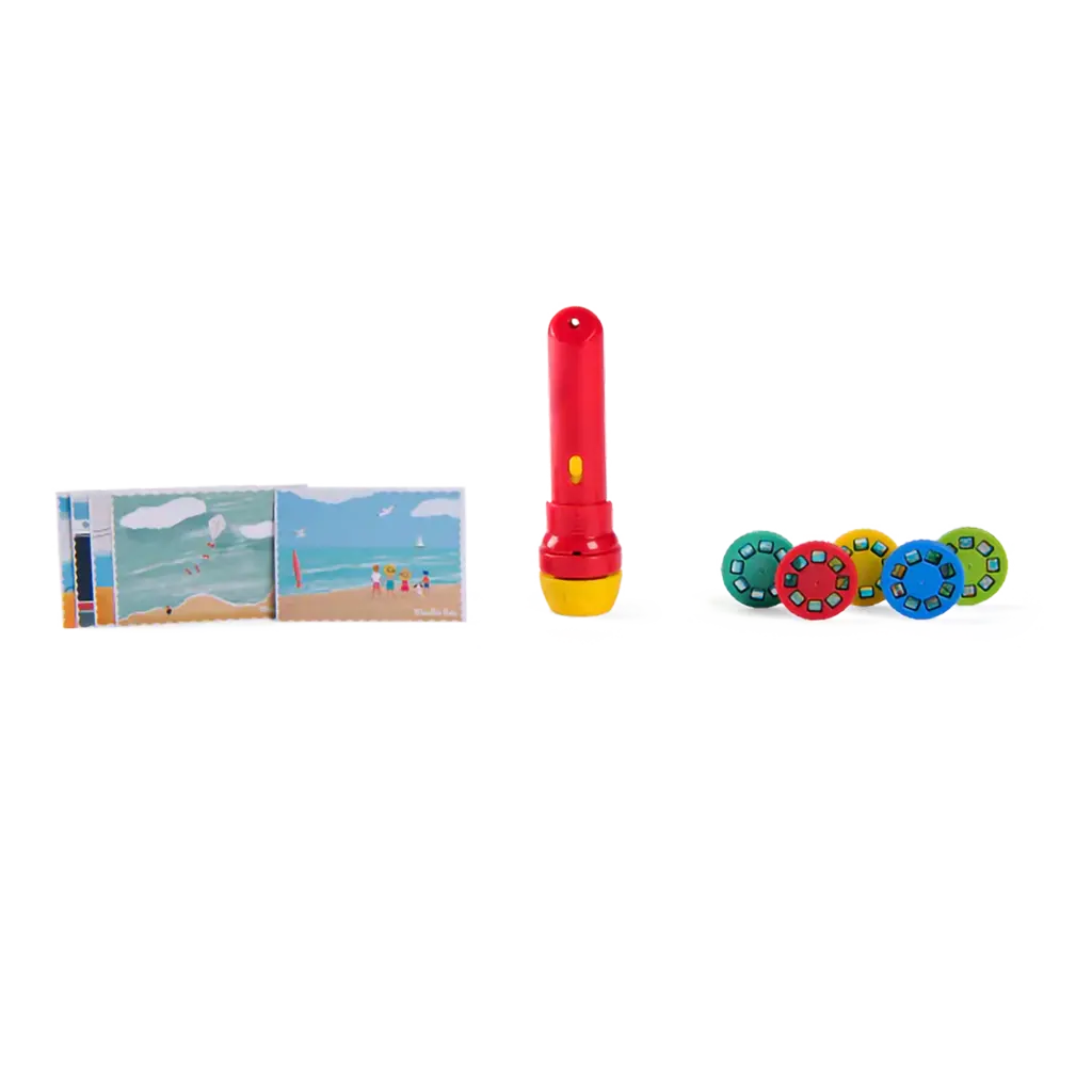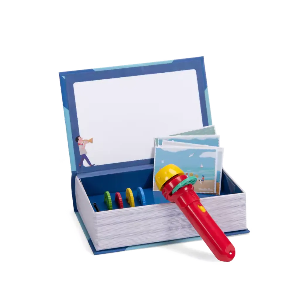 Coffret avec écran de projection, joliment illustré ! Conçu comme un livre, contient une lampe à projeter, 5 disques de petites aventures poétiques et 5 cartes postales.