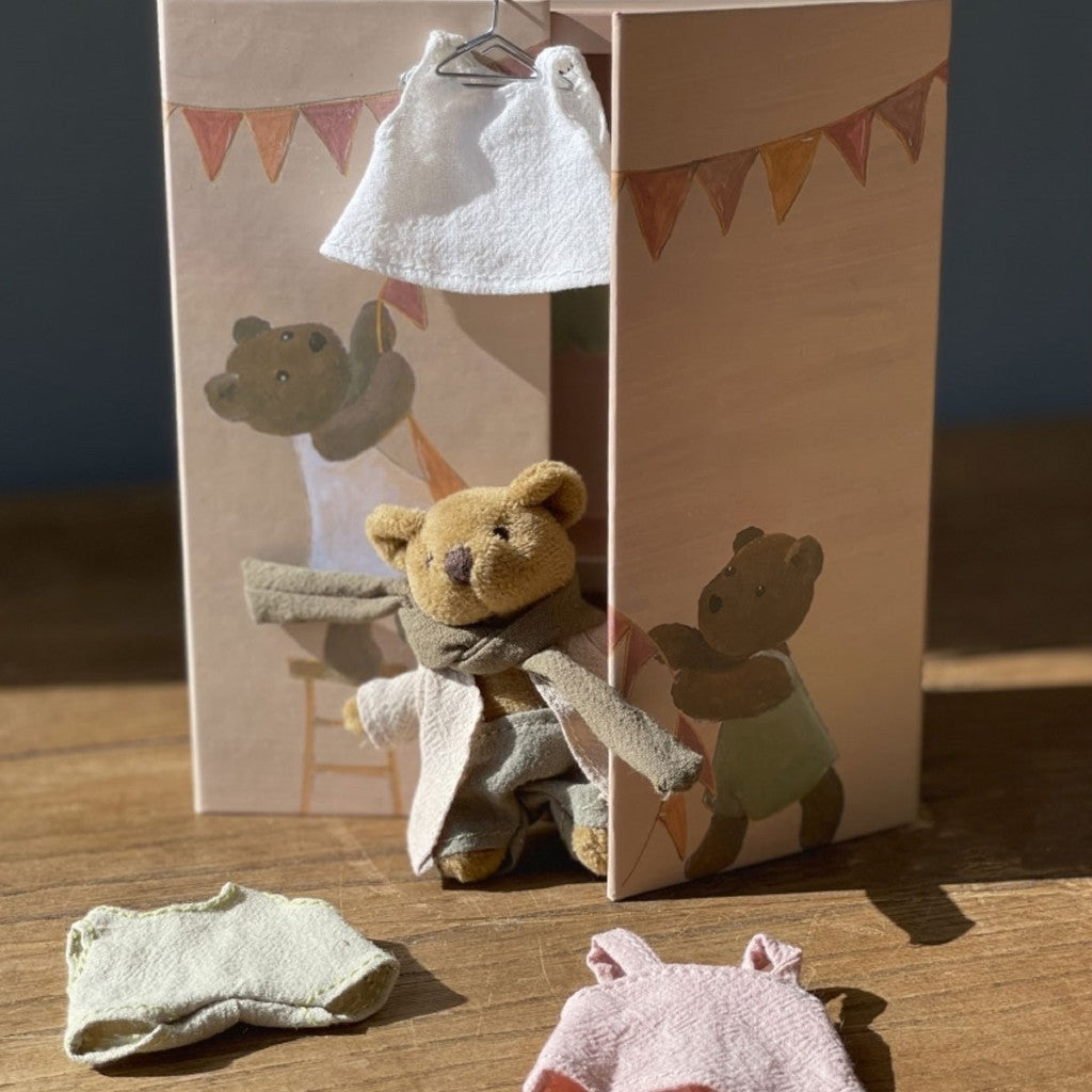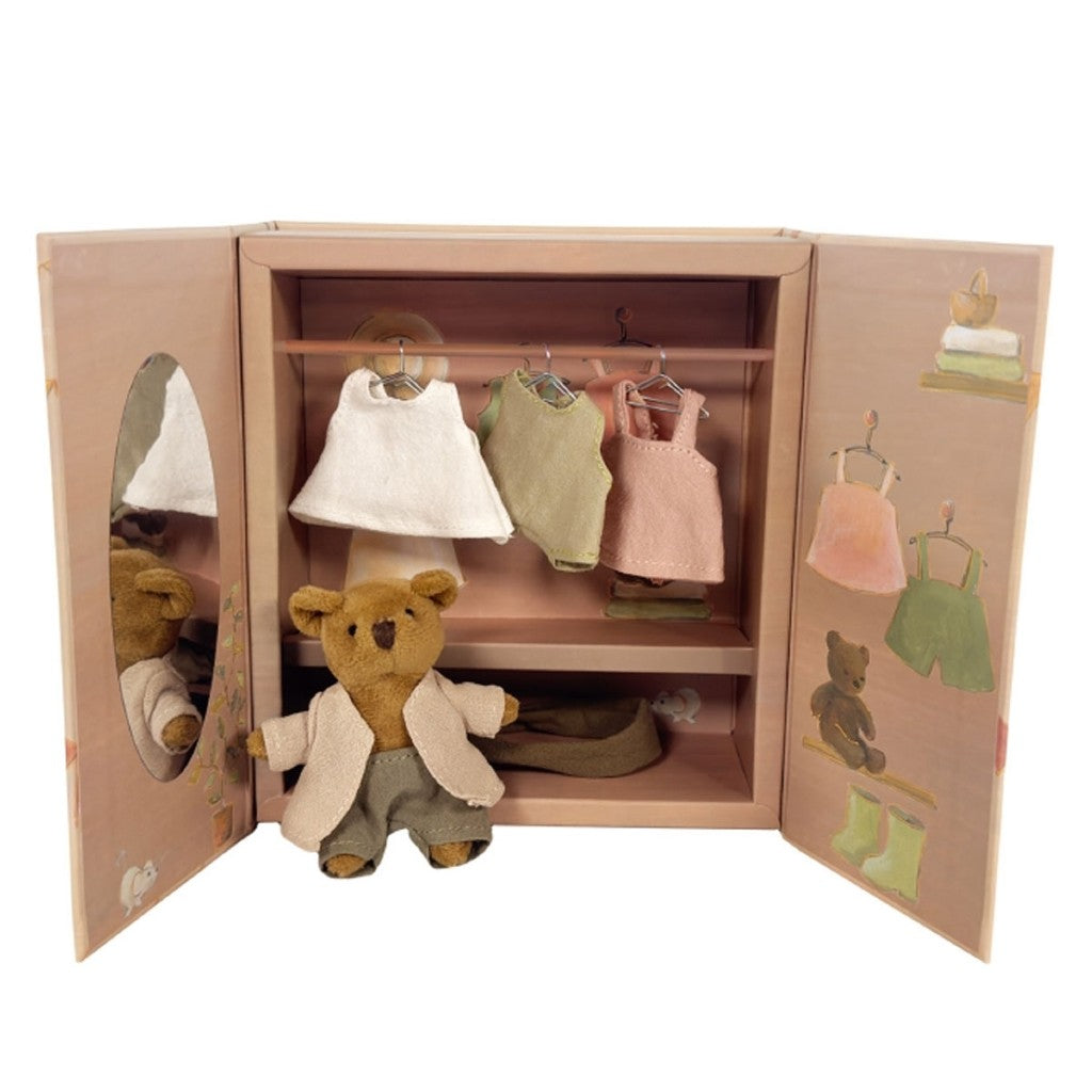 Garde-robe avec ours et vêtements. L'armoire de l'ours est garnie d'un miroir et de petits cintres pour suspendre soigneusement ses vêtements.