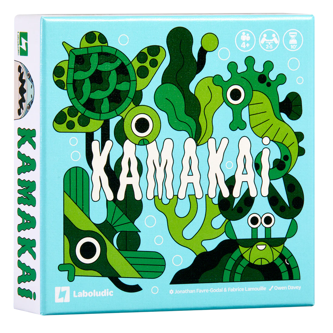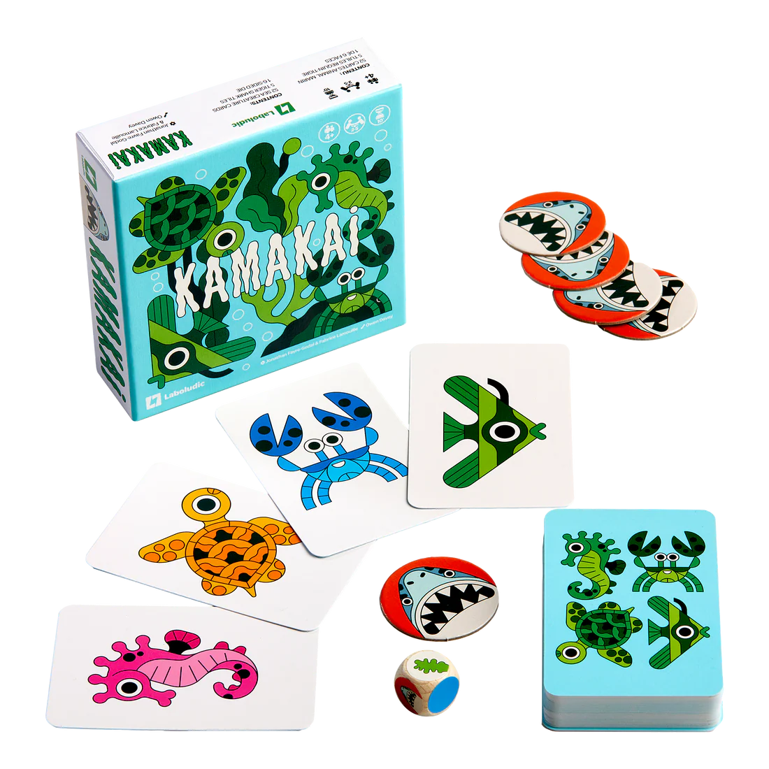 Mais attention au terrible Kamakaï, le plus grand des requins-tigres, qui rôde lui aussi dans ces eaux. But du jeu : être le premier à rassembler 1 poisson, 1 tortue, 1 crabe et 1 hippocampe devant soi. Mais méfiez-vous des attaques du Kamakaï ! Un simple jet de dés pourrait bien faire fuir l'un de vos animaux.