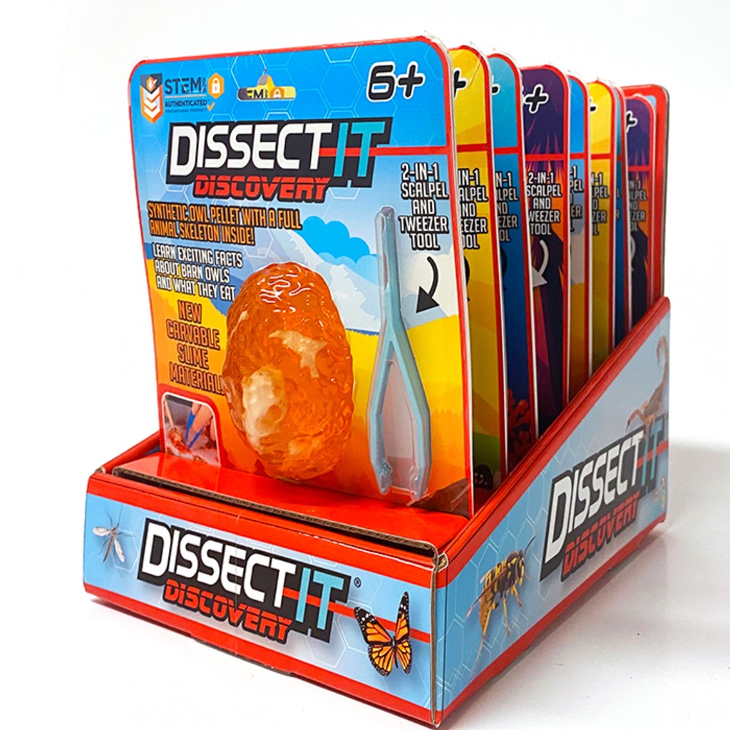 Dissect-It Discover-It est la toute nouvelle extension de la marque Dissect-It, spécialisée dans les kits de dissection synthétiques STEM. Chaque ensemble invite les utilisateurs à explorer différentes facettes de la nature en disséquant des versions synthétiques d’éléments tels qu’un cocon de papillon, une pelote de réjection de chouette, une huître ou un morceau d’ambre. Ces objets sont fabriqués à partir d’un matériau exclusif, sculptable, écologique et ressemblant à de la gélatine.