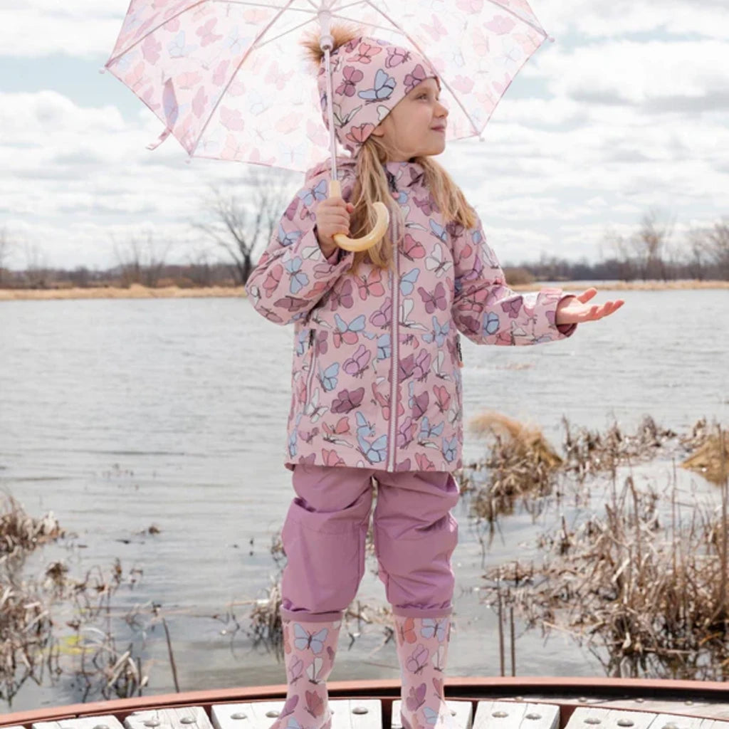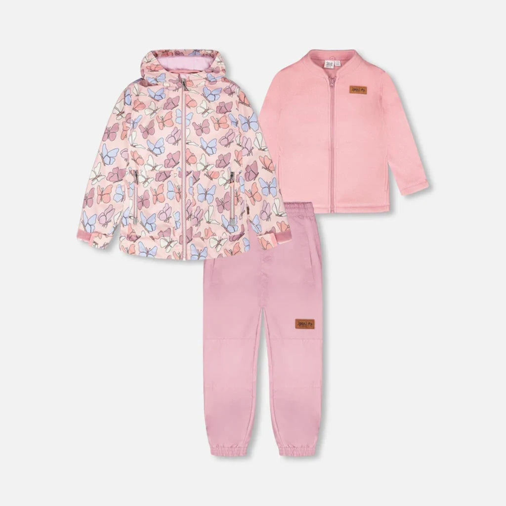Conçu pour s’adapter aux caprices de la météo, cet ensemble d’extérieur mi-saison 3-en-1 rose à imprimé papillons combine chaleur, polyvalence et responsabilité écologique. Il comprend un manteau, une veste en polaire amovible et un pantalon uni assorti, confectionnés à partir de fibres recyclées et traités avec le protecteur sans fluorocarbone BIONIC-FINISH® ECO. Avec son capuchon doublé en polaire, ses genoux renforcés et ses bandes réfléchissantes, cet ensemble garde les filles bien au chaud et protégées tout au long de la saison.