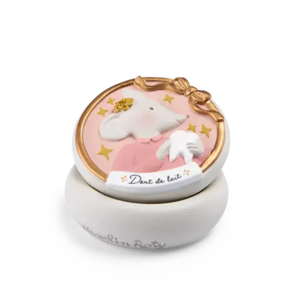 Délicate boîte à dents de lait en résine aux couleurs de la gamme avec en volume le portrait de la collection qui gardera précieusement les premières dents de bébé.