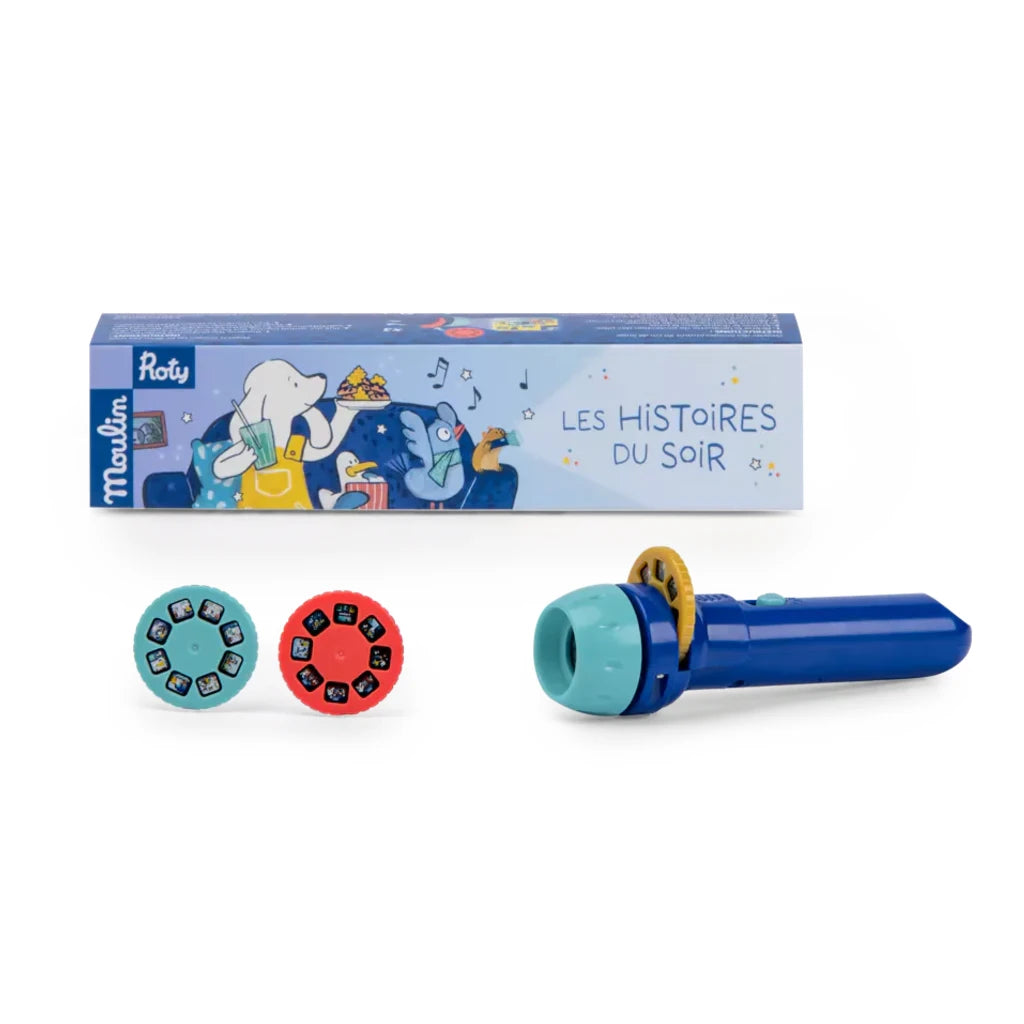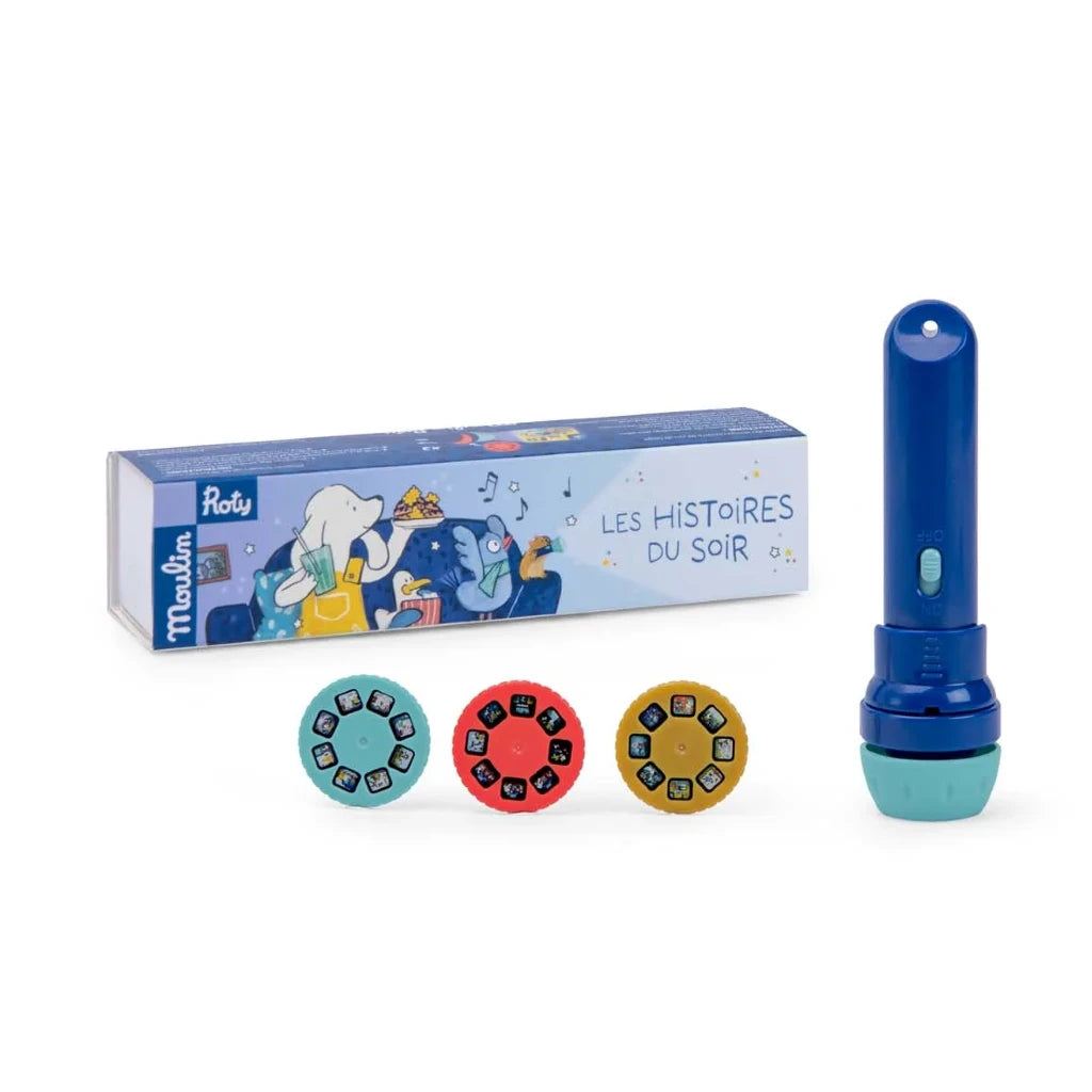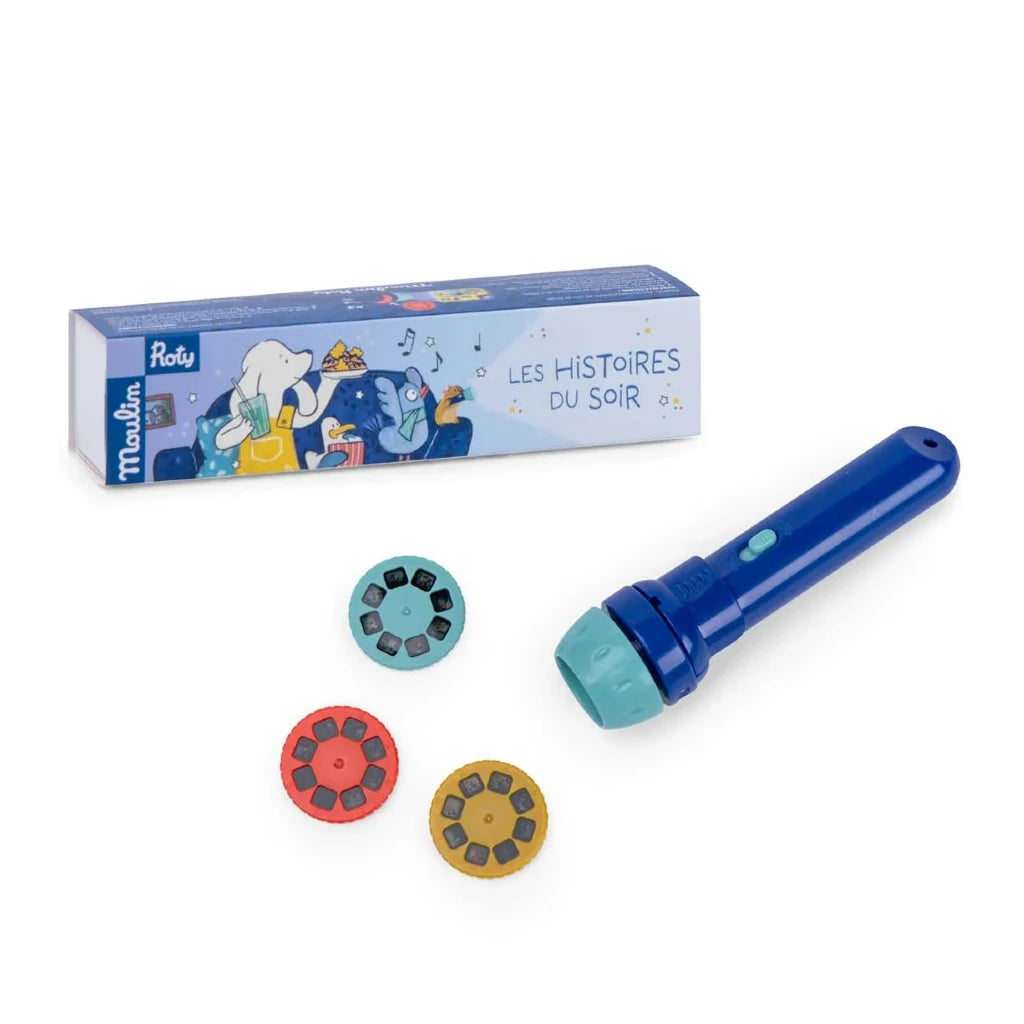 Le kit comprend une lampe torche et trois disques, chacun comportant 8 images. Il suffit d'insérer un disque dans la lampe torche, de l'allumer et, comme par magie, de magnifiques images sont projetées sur le mur !