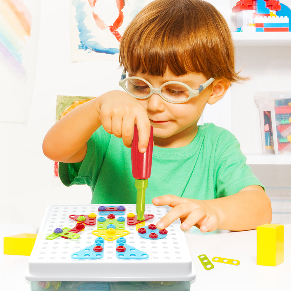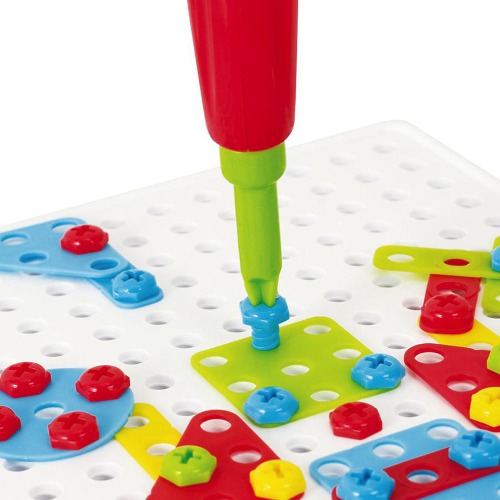 Ensemble de pièces percées que l’enfant doit fixer, à l’aide de vis et d’un tournevis, sur une planche perforée.