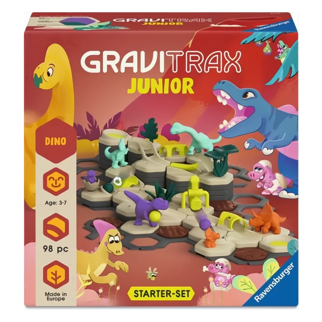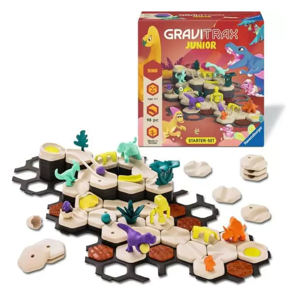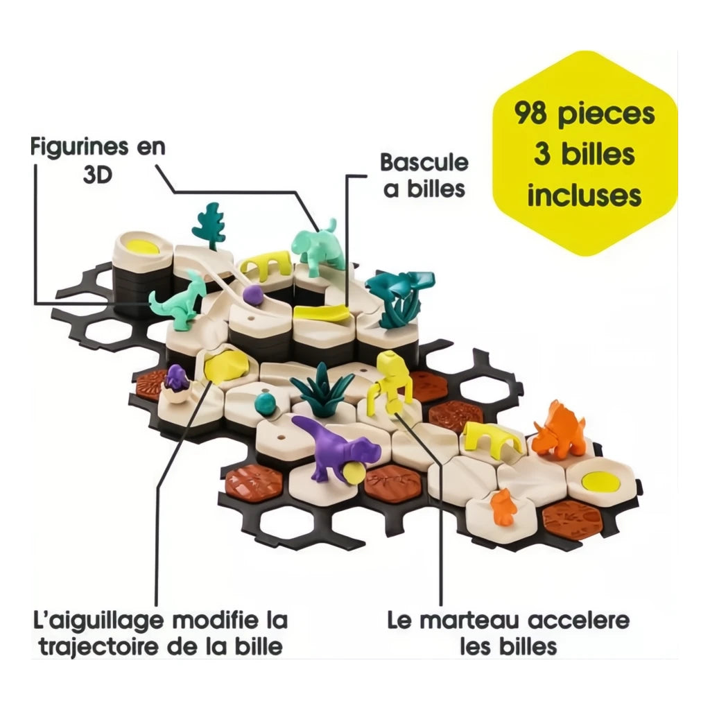 GraviTrax Junior permet aux enfants dès 3 ans de s'initier à la construction de circuits de billes à travers la thématique des dinosaures, avec des matériaux biosourcées.