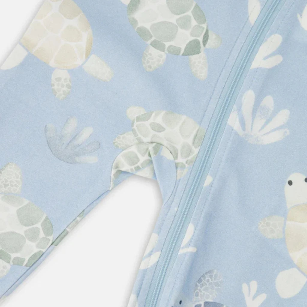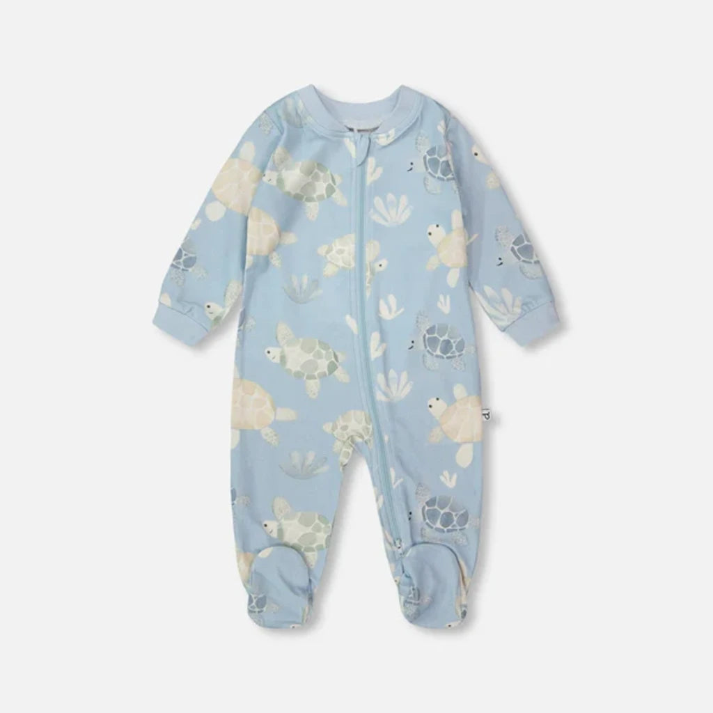 Le pyjama une-pièce en jersey de coton biologique bleu à imprimé tortues est conçu pour garder les petits garçons bien au chaud jour et nuit. Ce modèle à pieds a des manches longues, un col rond et une fermeture éclair intégrale pour un habillage facile et rapide. Confectionné en coton biologique respirant avec une touche d’élasthanne, il assure confort et liberté de mouvement. Idéal pour le coucher, les jeux ou les moments de détente à la maison, il allie praticité et fantaisie. Une pièce douillette de notre collection "À pas de tortue" pour illuminer la saison.
