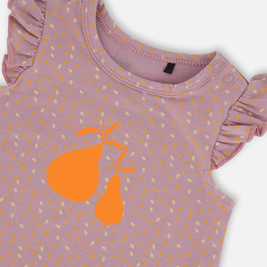 Rendez chaque occasion de temps chaud un peu plus douce avec notre ensemble haut et bloomer imprimé mauve avec poires et graines orange en coton biologique. Cet ensemble deux pièces, orné d'un charmant imprimé de graines de poires, est assorti de la tête aux pieds par un bloomer à taille élastique et un haut en jersey extensible à manches papillon avec un double imprimé de poires sur la poitrine.