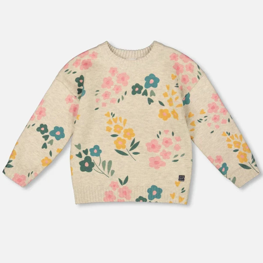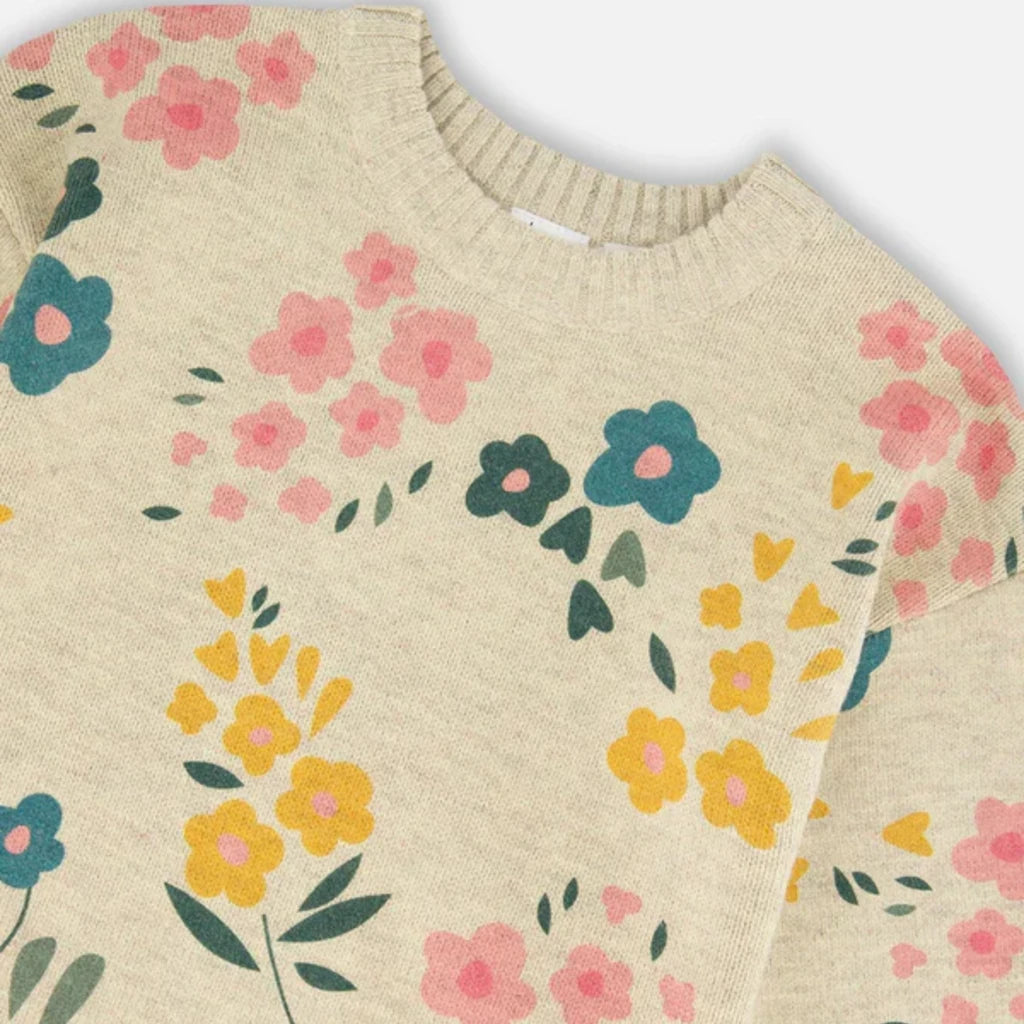 Le sweat en tricot gris beige chiné à imprimé floral allie douceur et charme rétro. Confectionné dans une maille confortable, ce pul en tricot se distingue par ses manches longues, ses épaules tombantes, son col rond, ses poignets et ses bordures côtelés, ainsi que son imprimé fleuri dans des tons roses, orange et bleus. Parfait à associer avec un legging ou une jupe de la collection « Colchiques dans les prés ».