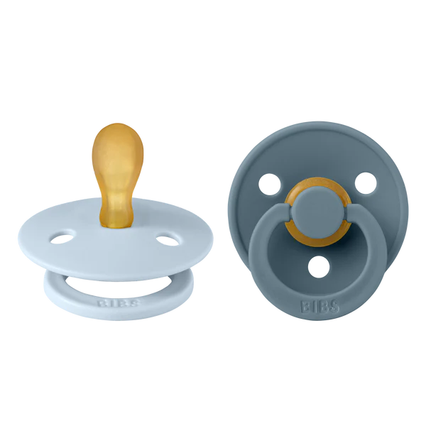 BIBS Color est la sucette BIBS originale et est sur le marché depuis plus de 40 ans. Il a le bouclier rond BIBS avec trois trous d'aération et un anneau de poignée rond gravé BIBS. Le mamelon de forme anatomique est incurvé en haut pour un ajustement naturel au palais du bébé avec une pointe inclinée pour un placement facile de la langue.