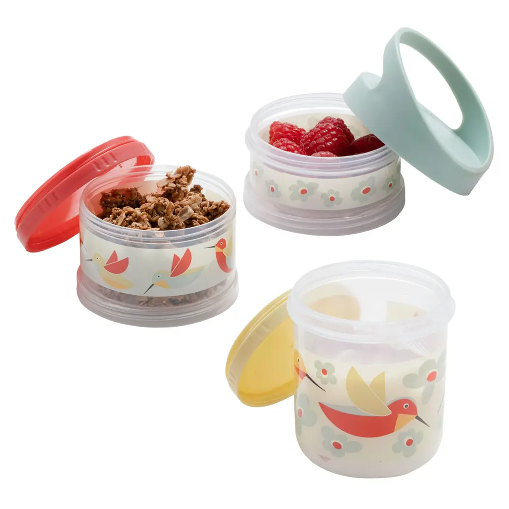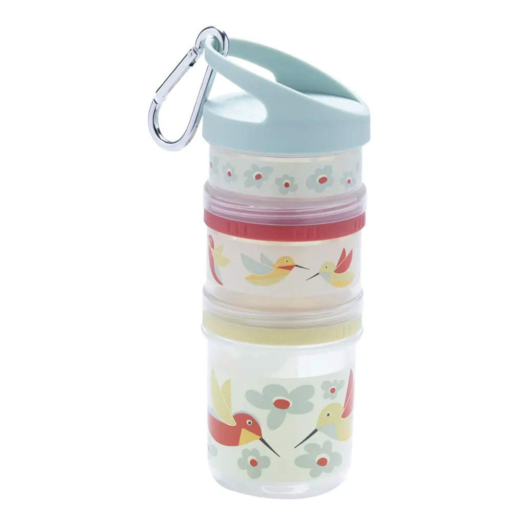 Twist & Snack Stacker est un contenant empilable pour les en-cas, les ingrédients de smoothies ou les préparations pour nourrissons. Plus besoin de sacs plastiques, les empileurs permettent de conserver les aliments empilés, séparés et simples. Préparez facilement un en-cas à trois étages en une seule étape !