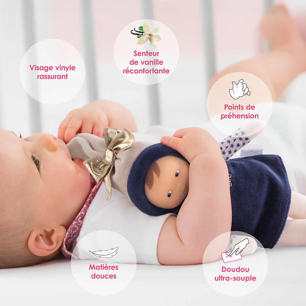 Parfaite pour accompagner bébé partout, Miss Marine Rêves d'Étoiles est la petite poupée qui ne sera jamais oubliée. Elle est parfaitement dimensionnée (25 cm de haut) pour que les petites mains puissent la saisir et la tenir par son bas, son chapeau, ses bras, ses jambes et même sa robe. Elle est faite d'un tissu ultra-doux qui la rend très câline. Son doux visage réaliste en vinyle charme et réconforte bébé et est délicatement parfumé à la vanille, une signature Corolle. Un plus pour les parents : Miss Marine Rêves d'Étoiles est dotée d'une étiquette cousue sur laquelle on peut écrire le prénom de bébé ou un numéro de téléphone au cas où la poupée serait perdue.