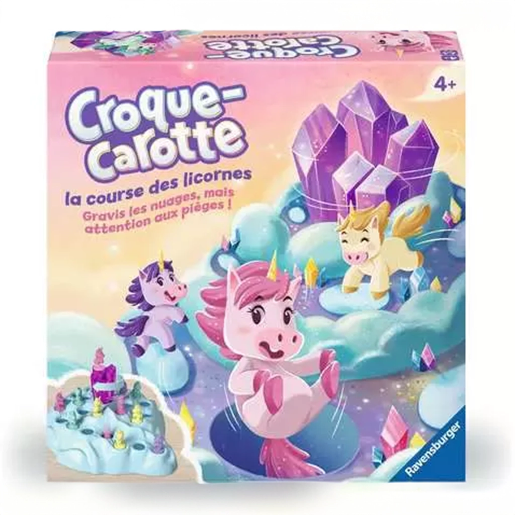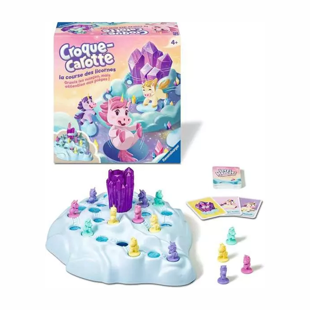 Croque Carotte Licorne est un jeu de course basé sur le système de jeu Croque Carotte avec les lapins. Considéré comme un classique des jeux pour enfants avec ses diverses nominations, il s'immerge aujourd'hui dans l'univers féerique des licornes. Incarne une licorne et tente de rejoindre en premier le sommet du nuage. Les règles sont simplissimes et s'apprennent en quelques secondes seulement ! Une fois le matériel installé sur la table, toute la famille est prête à jouer. Ce jeu permet d'initier en douceur les enfants aux premiers jeux de société. Après quelques parties et une fois que les enfants sont à l'aise avec le matériel de jeu, ils sont même capables de jouer seuls sans avoir besoin d'un adulte !