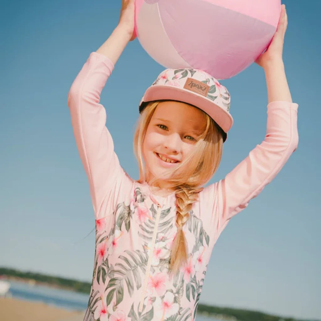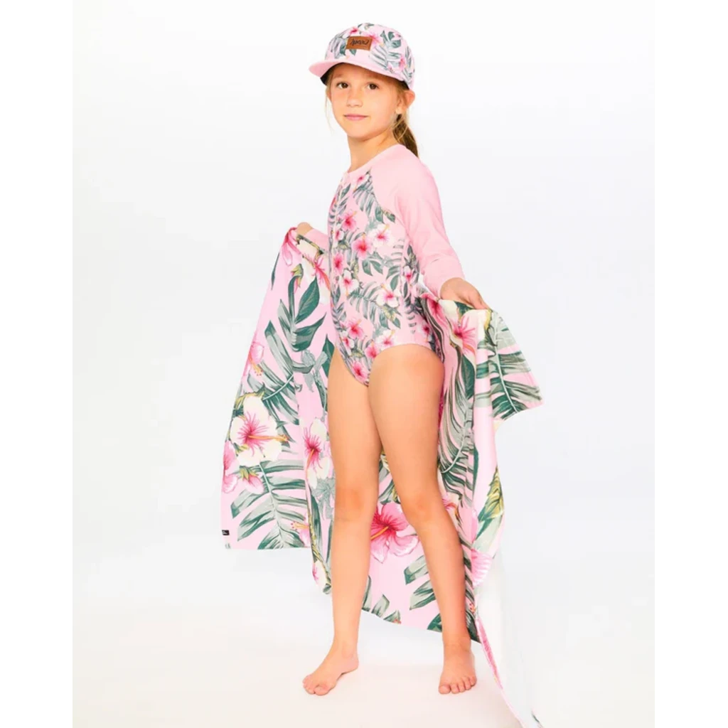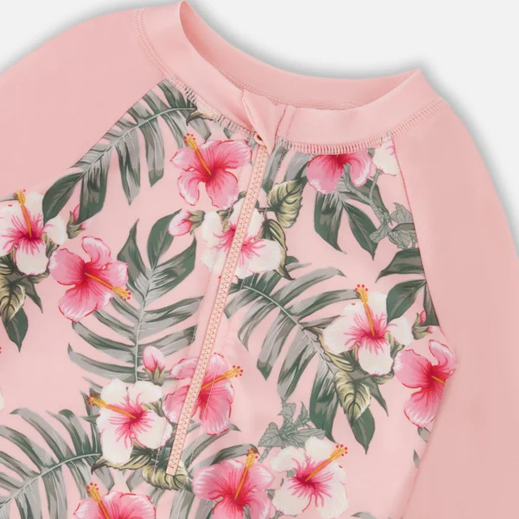 Le rashguard à manches longues une-pièce rose à imprimé hibiscus allie élégance et protection solaire. Ce maillot de bain arbore un imprimé tropical d'hibiscus sur le corps, complété par des manches longues unies et une fermeture éclair pratique à l’avant. Confectionné en polyester recyclé extensible, il offre confort et protection UPF, un choix idéal de notre collection "Comme un poisson dans l’eau".