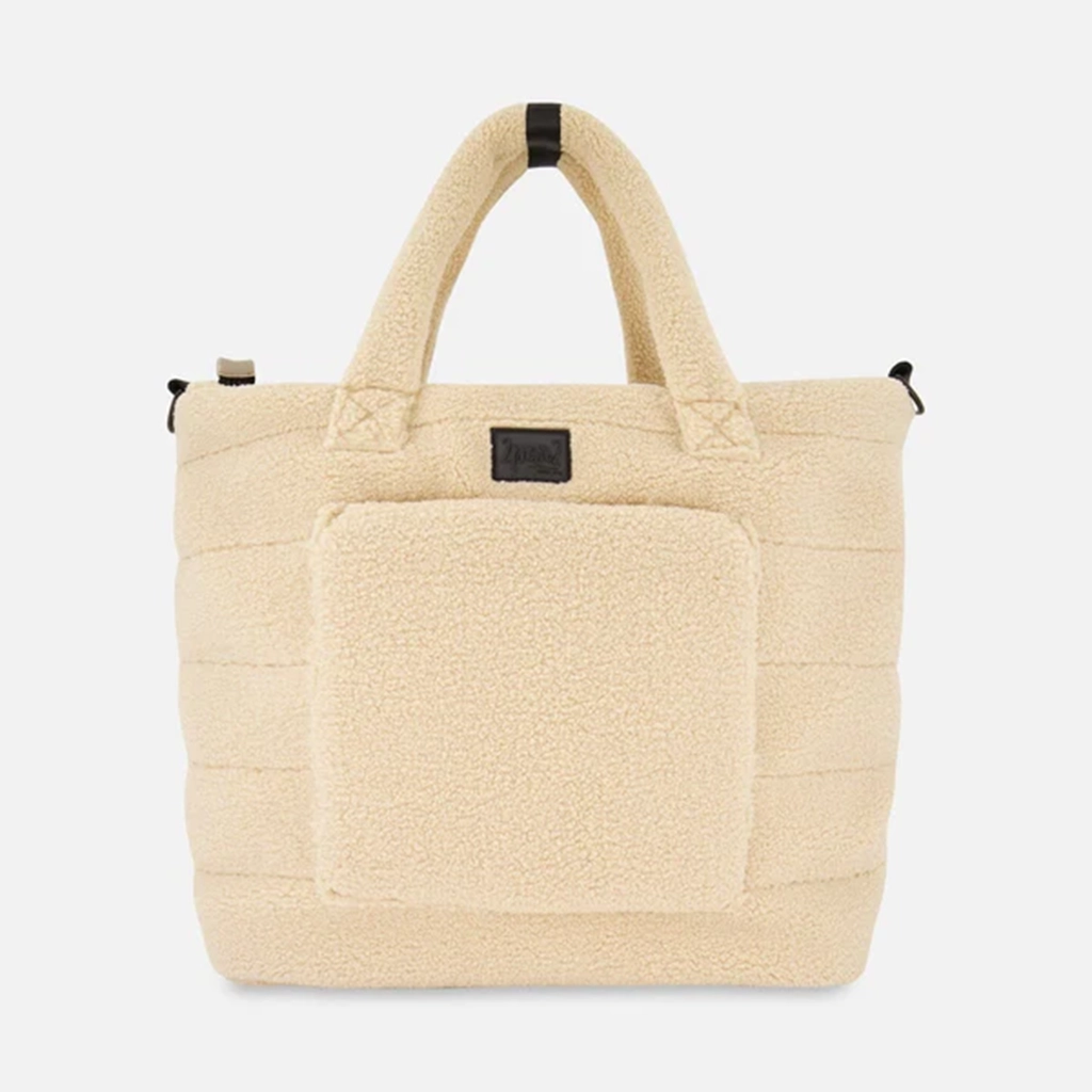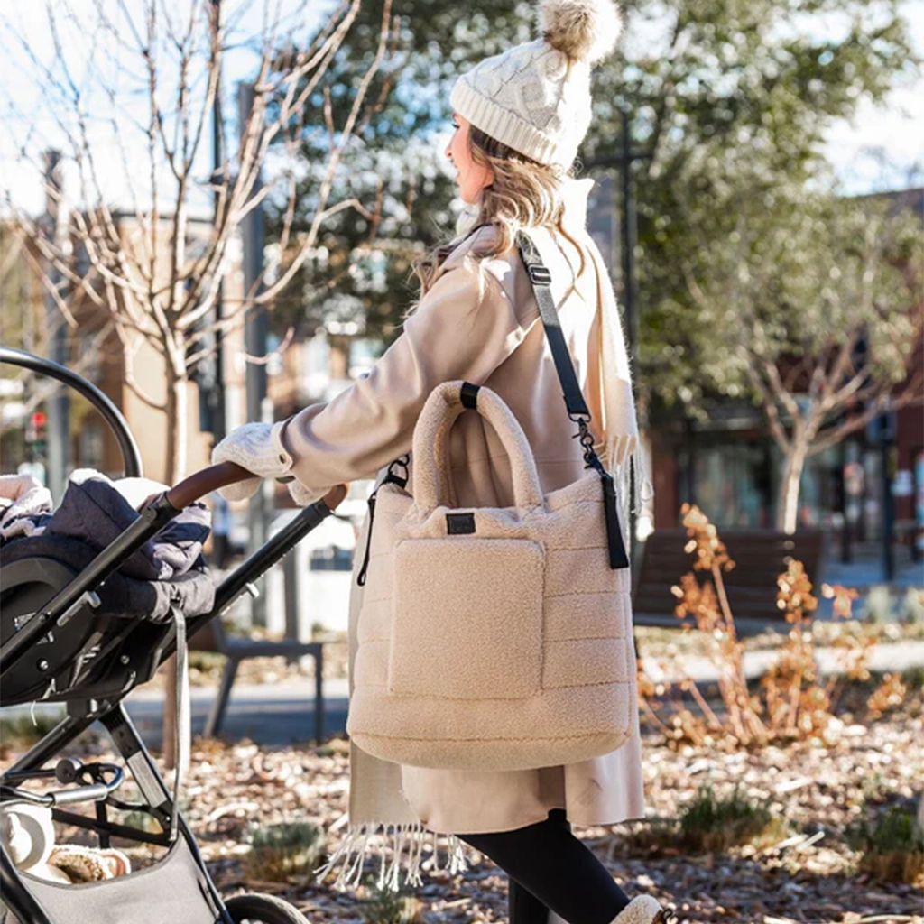 Notre sac à couches fourre-tout beige est rempli de poches et de détails pour contenir tous vos essentiels de maman et de bébé. L'intérieur comprend une grande poche contenant un tapis à langer lavable, des poches élastiques pour contenir les biberons et la nourriture pour bébé, ainsi qu'une poche à fermeture éclair pour les petits accessoires. À l'extérieur, on trouve une poche à fermeture éclair sur le devant, des poignées supérieures, une bandoulière détachable et de petites sangles détachables pour attacher au landau.